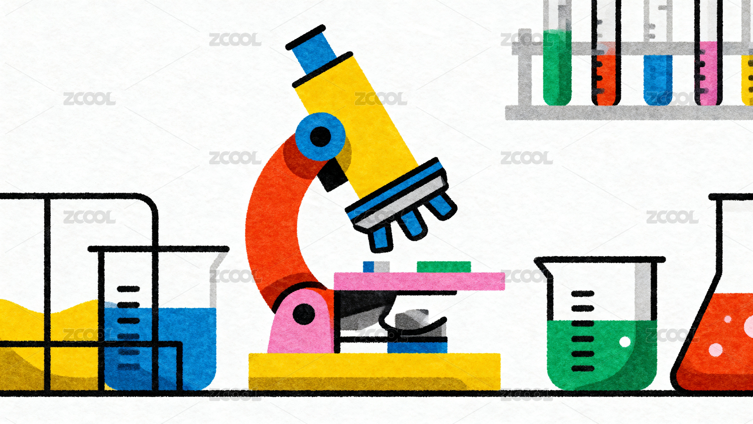 彩色 DNA 双螺旋结构旁摆放着几个实验