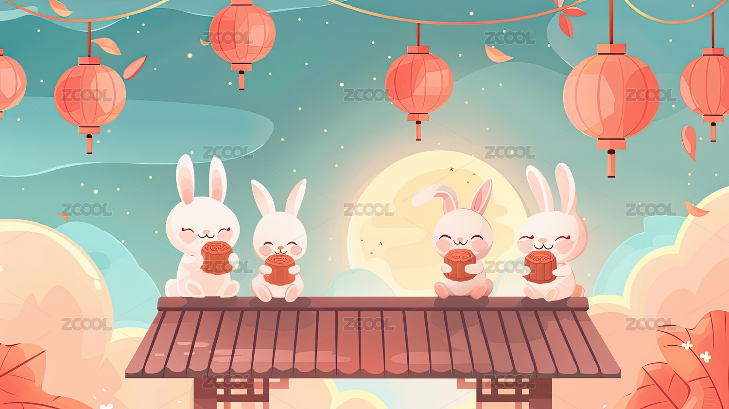 中秋节可爱国潮风玉兔传统节日赏月习俗插画