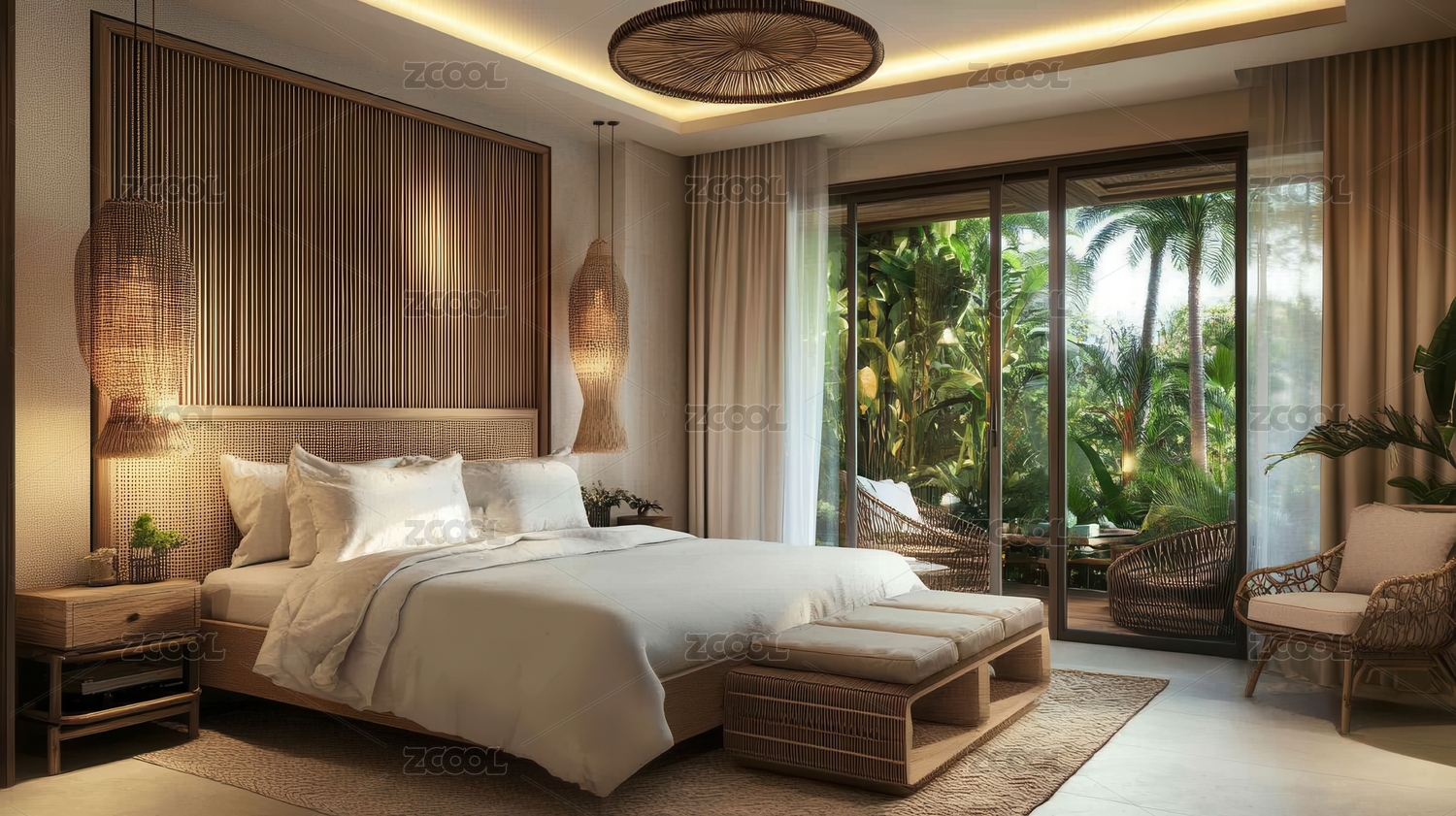 卧室,床,藤编,木质,室内设计,温馨,舒适,植物,装饰画,家居装饰
