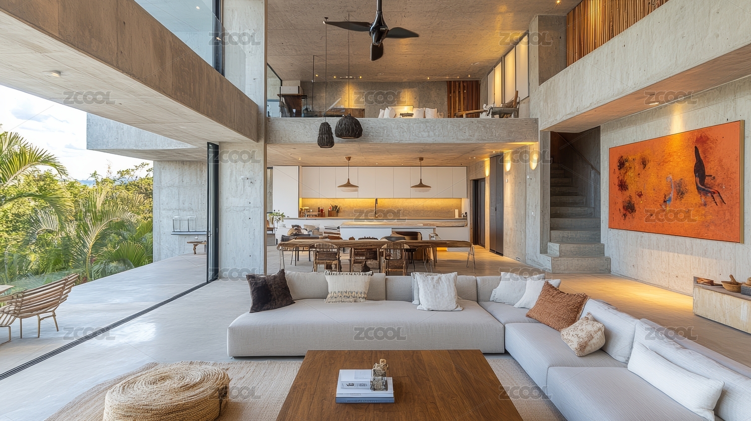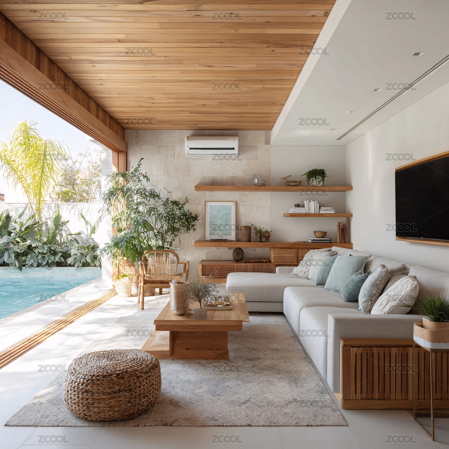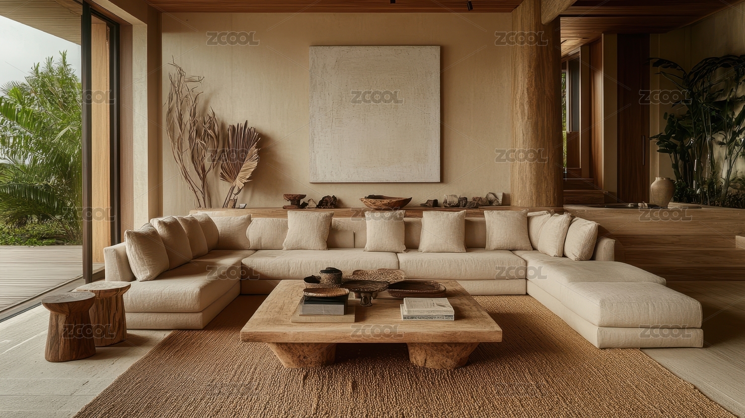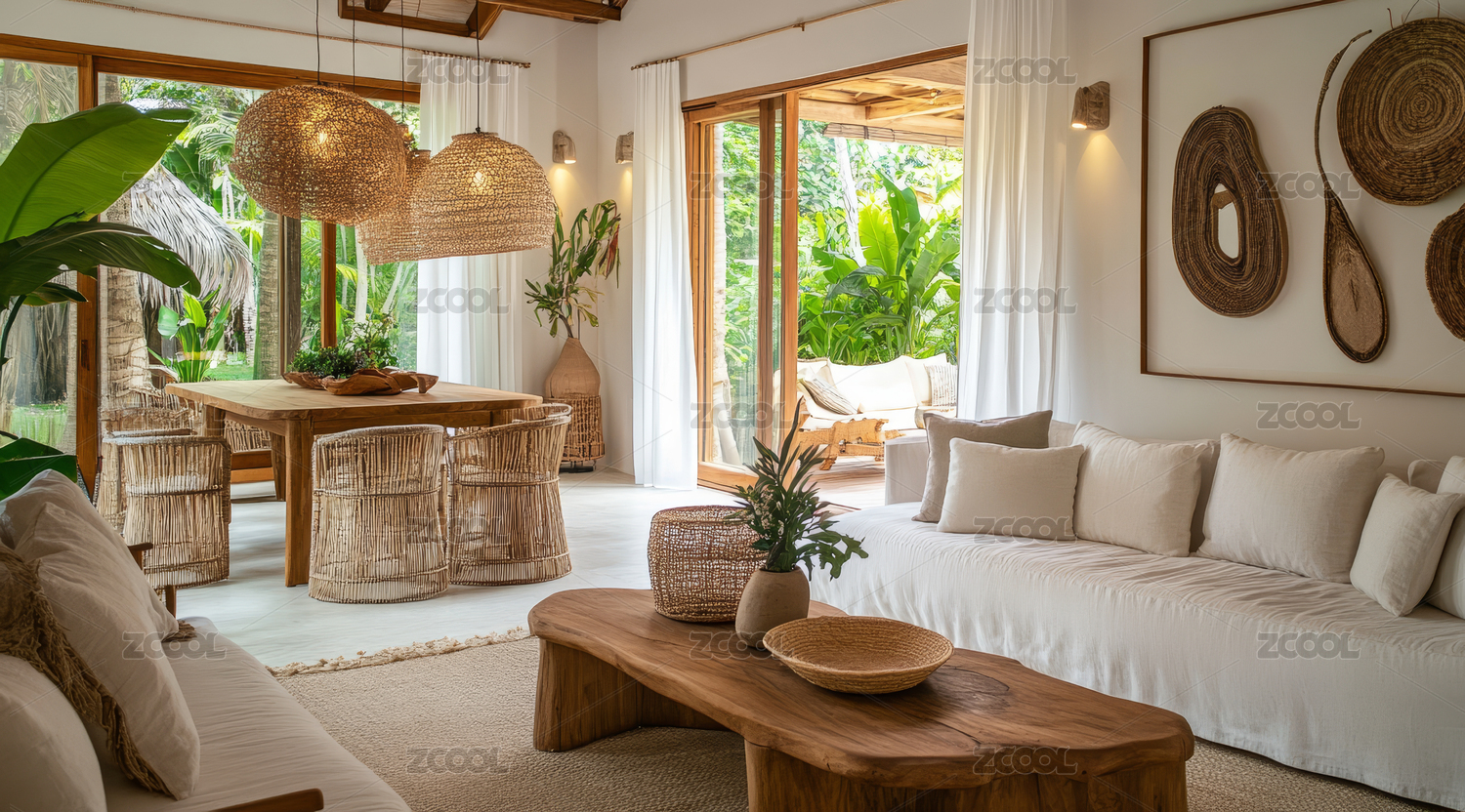 阳光洒落的热带度假别墅客厅