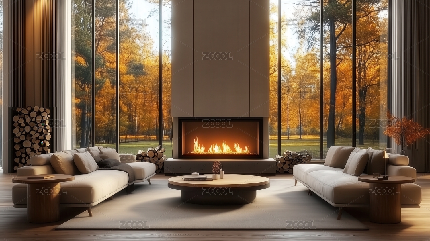 雪景,自然,宁静,舒适,住宅,森林,沙发,壁炉,简约,落地窗