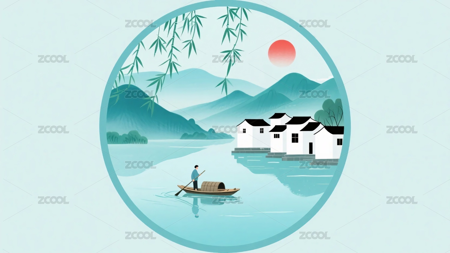 中式山水划船插画