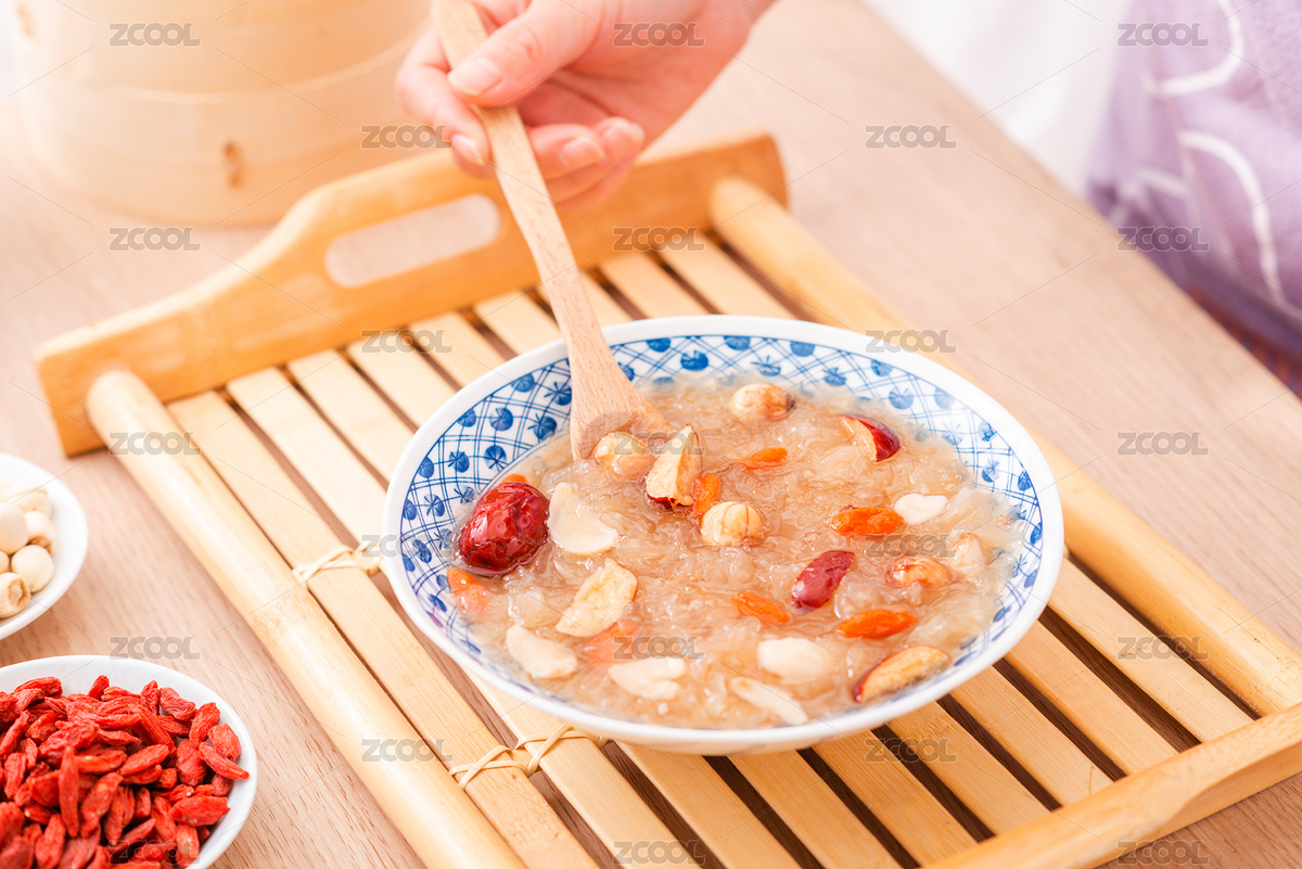 中式复古木纹桌子上的一碗红枣银耳莲子羹