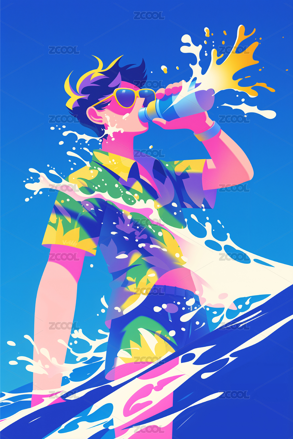 插画,炫彩,渐变,潮流,时尚,男性,饮料,吸管,叶子,帽子
