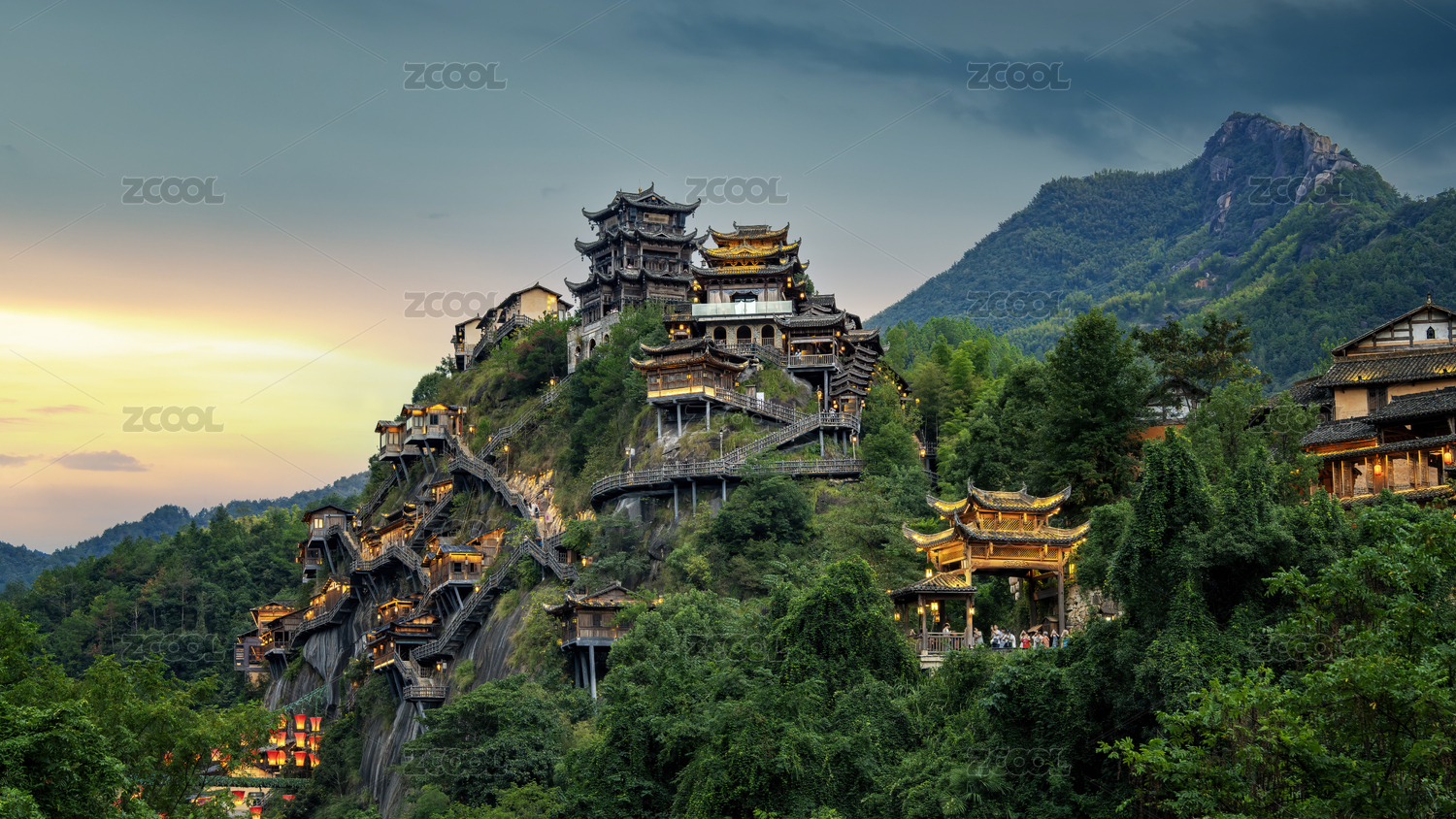 航拍望仙谷悬崖峭壁上的古建筑夜色