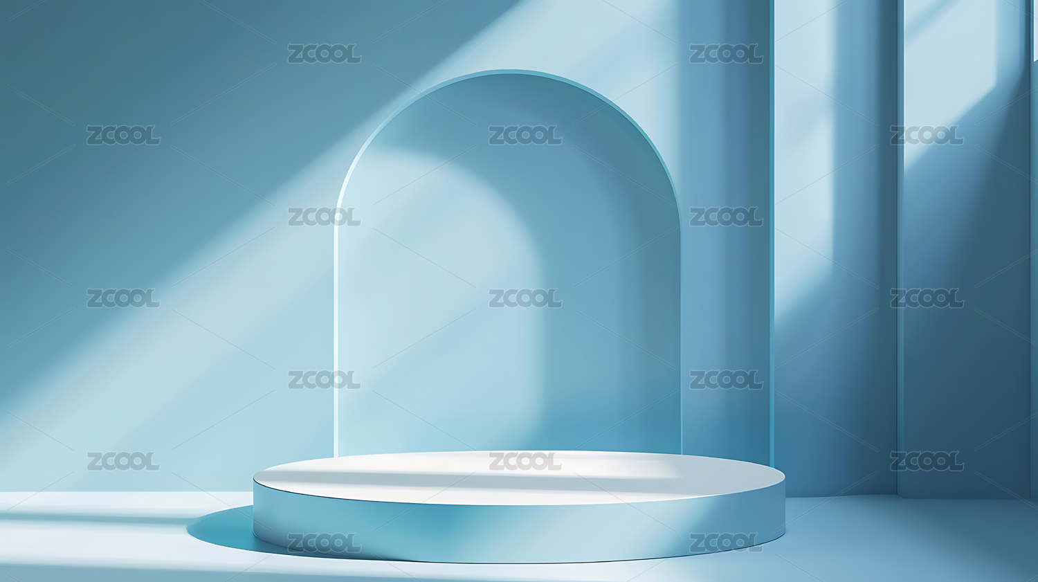 蓝色拱形背景的白色圆形展台