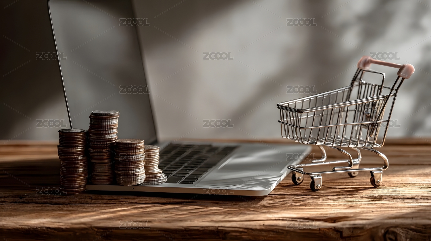 放在笔记本电脑上的算盘、金币和购物车