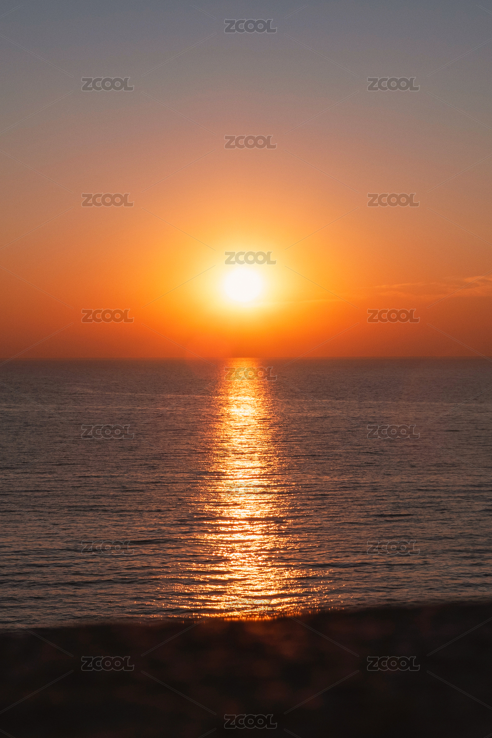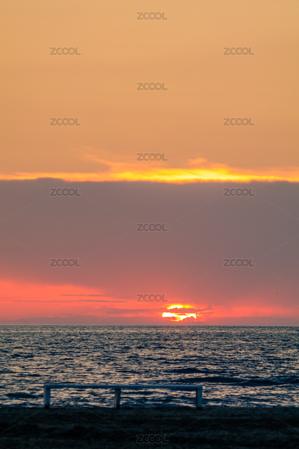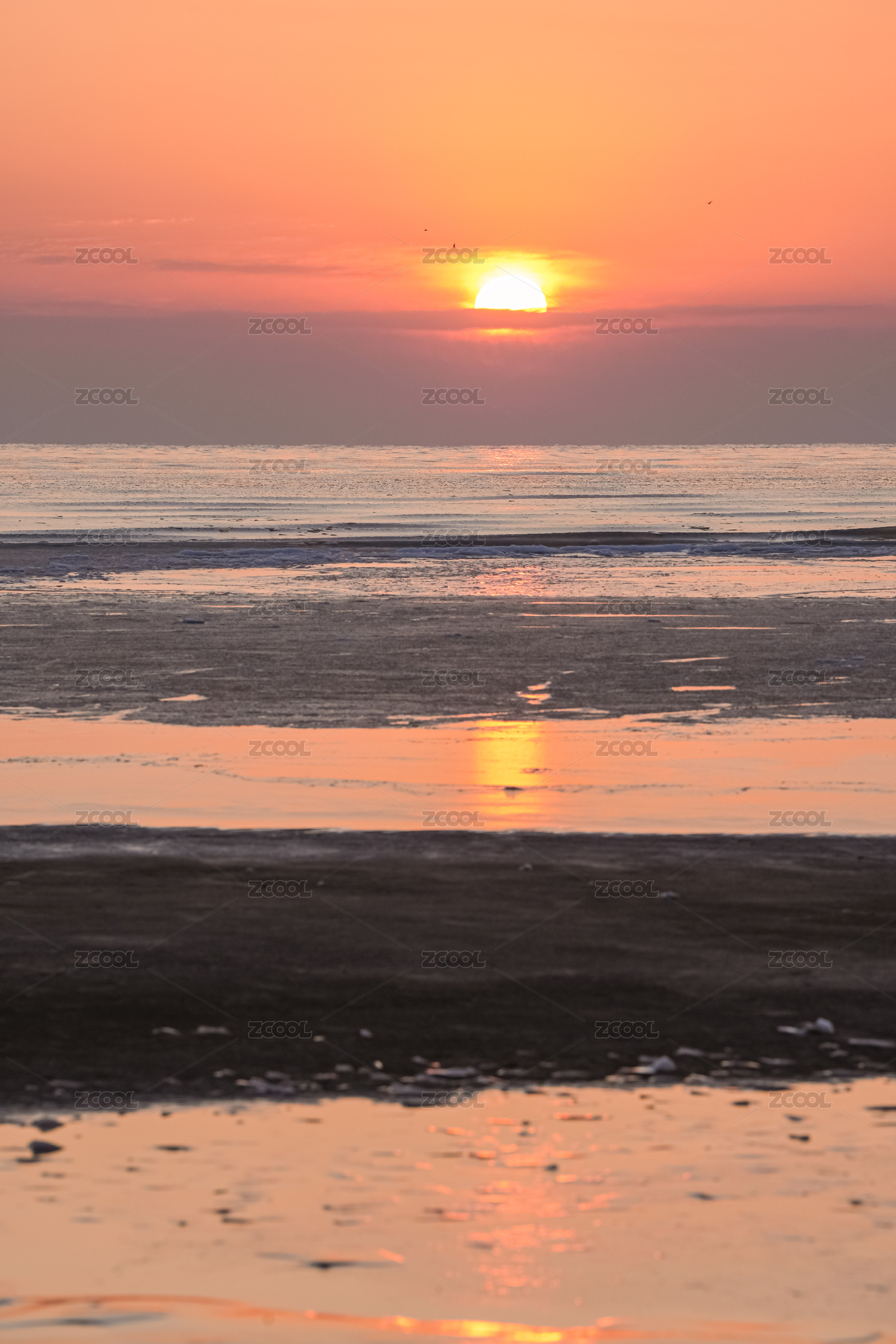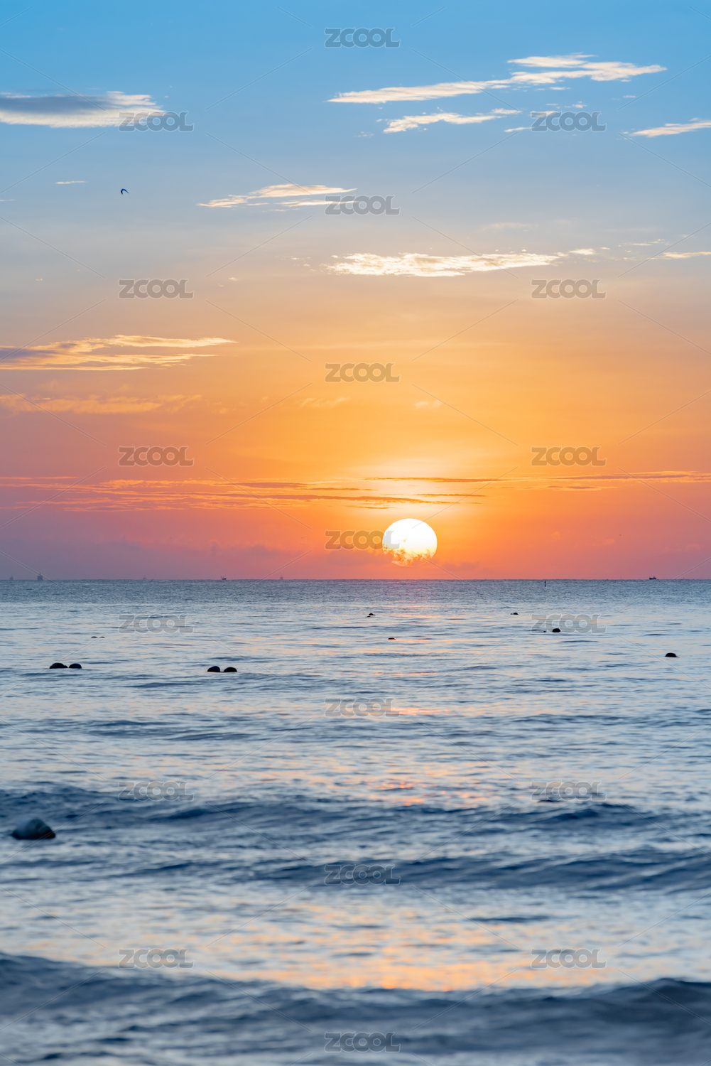 中国广东省湛江市东海岛中国第一长滩龙海天海滨浴场海滩沙滩上的海上日出朝霞