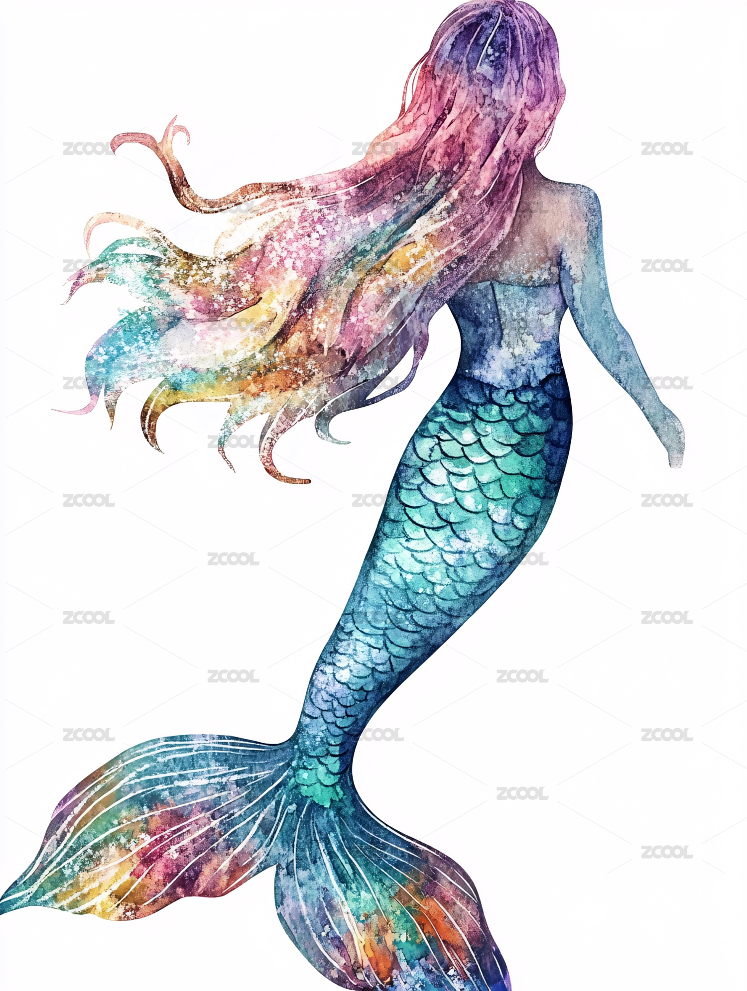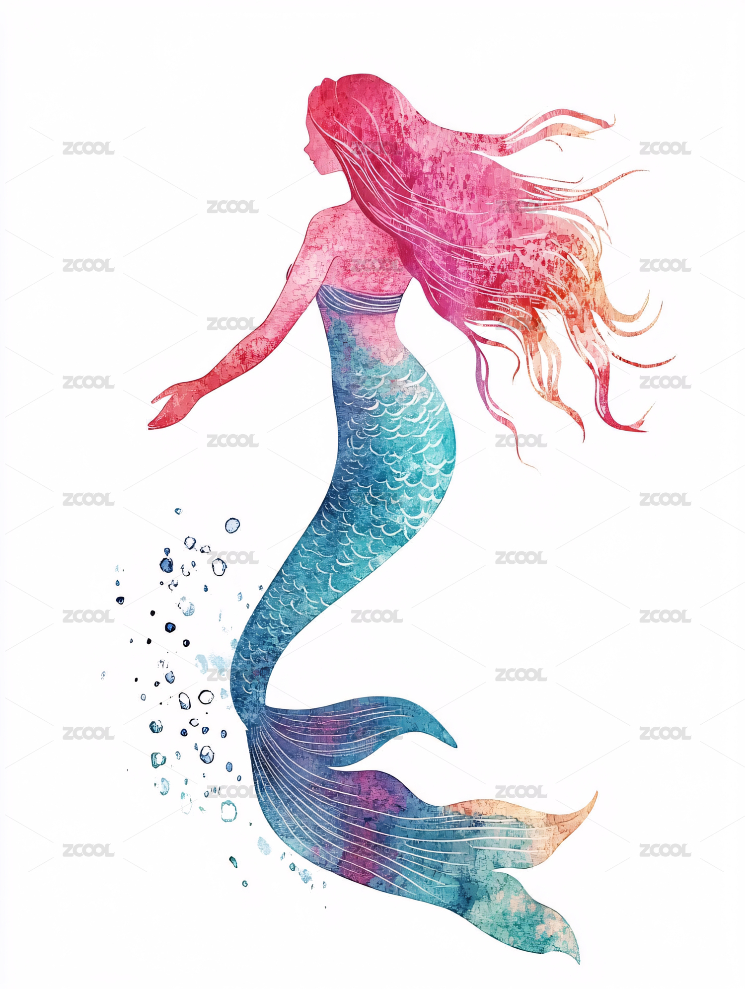 侧面美人鱼向上游蓝色海洋唯美清新简约插画