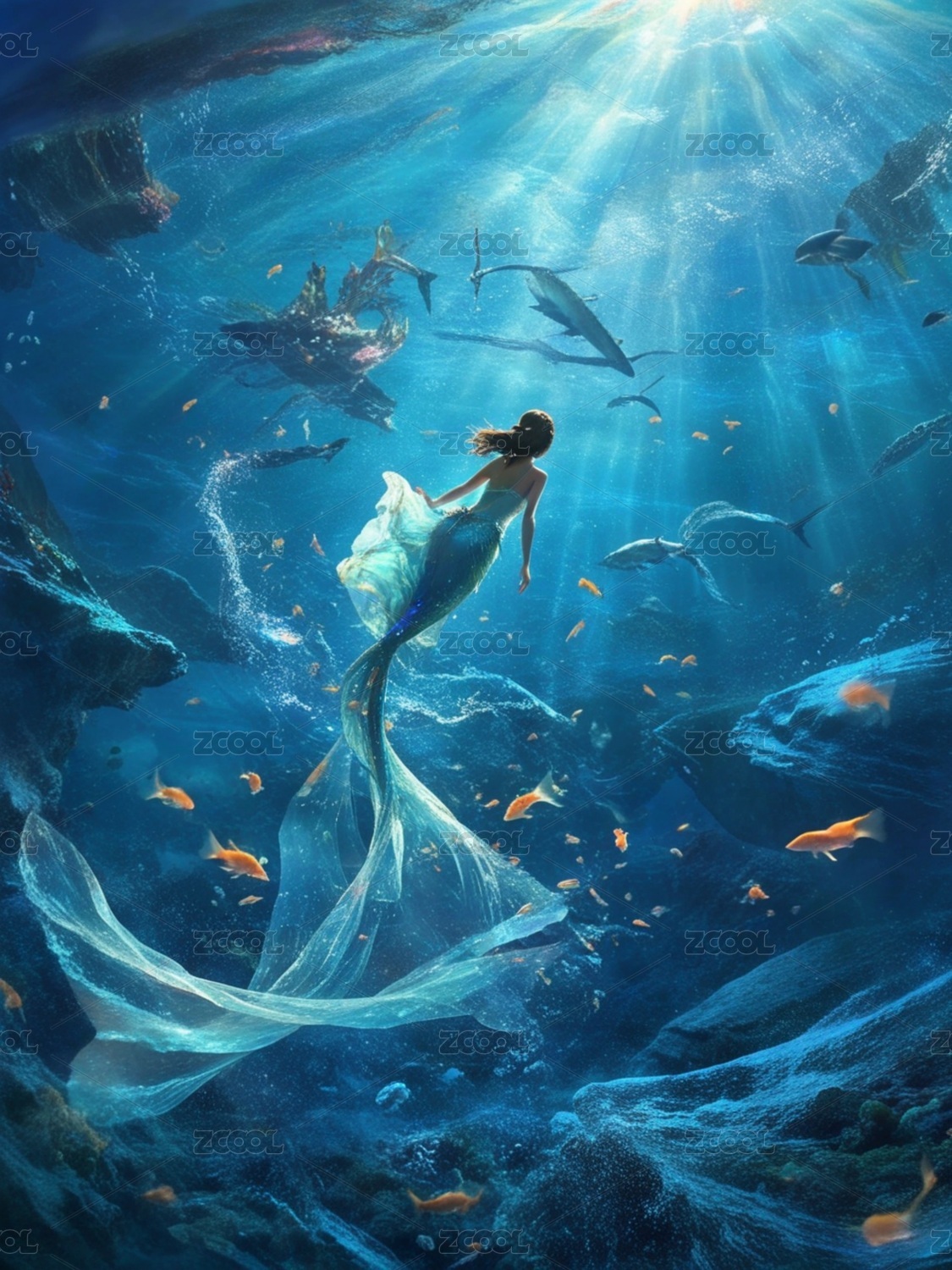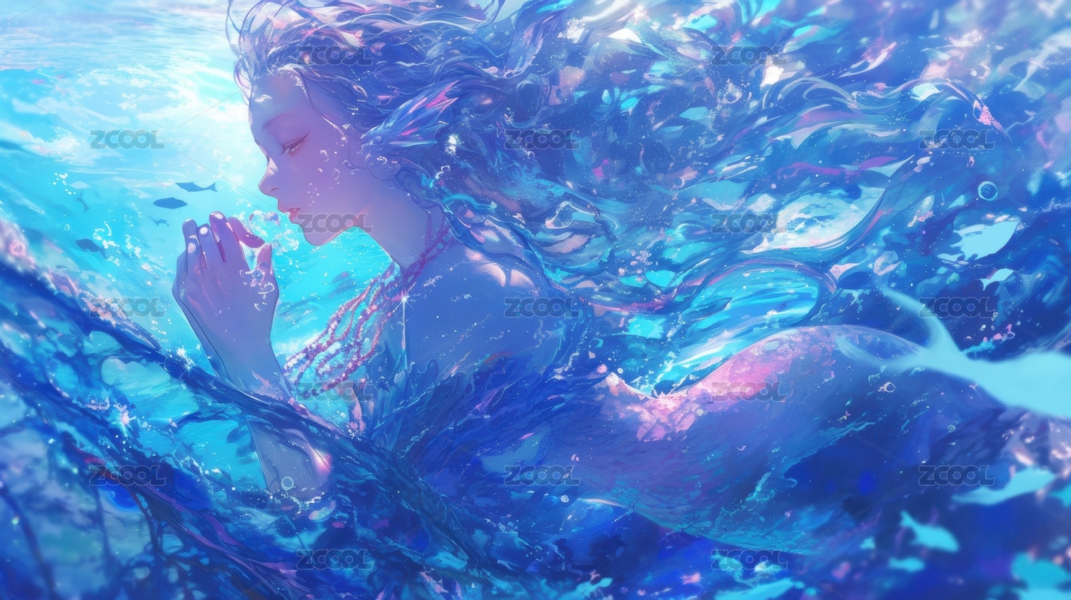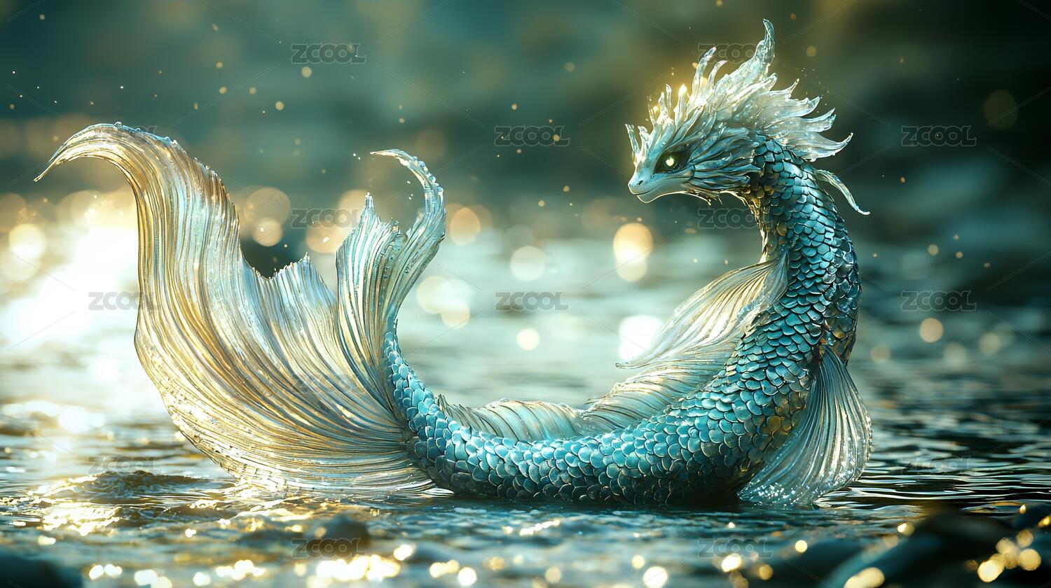 奇幻艺术,幻想风格,长发,超现实,金色鳞片,电影灯光,光辉,水面,海洋生物,美人鱼