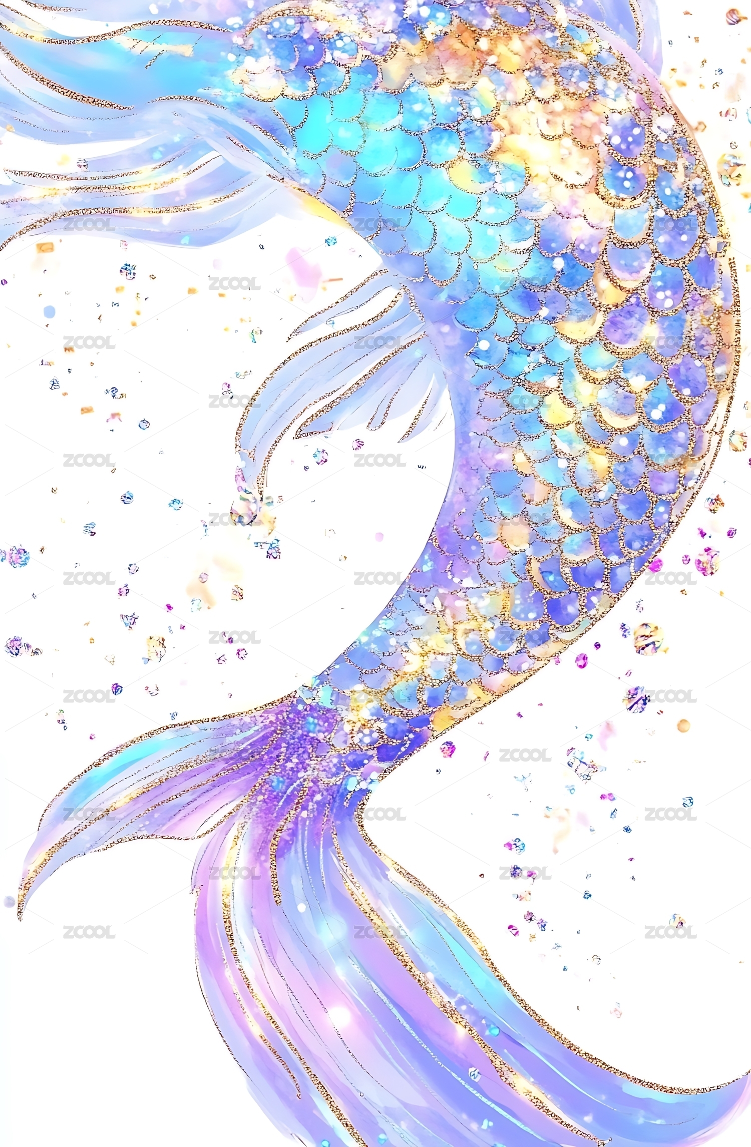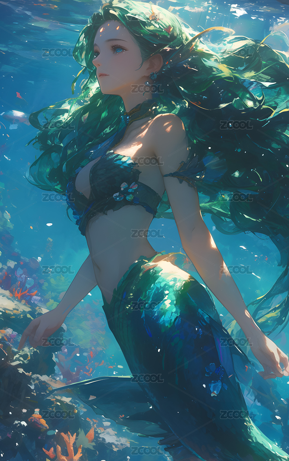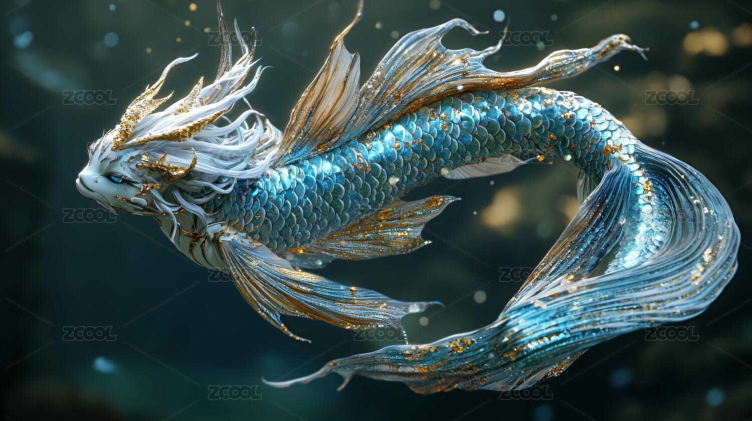 奇幻艺术,幻想风格,长发,超现实,金色鳞片,电影灯光,光辉,水面,海洋生物,美人鱼