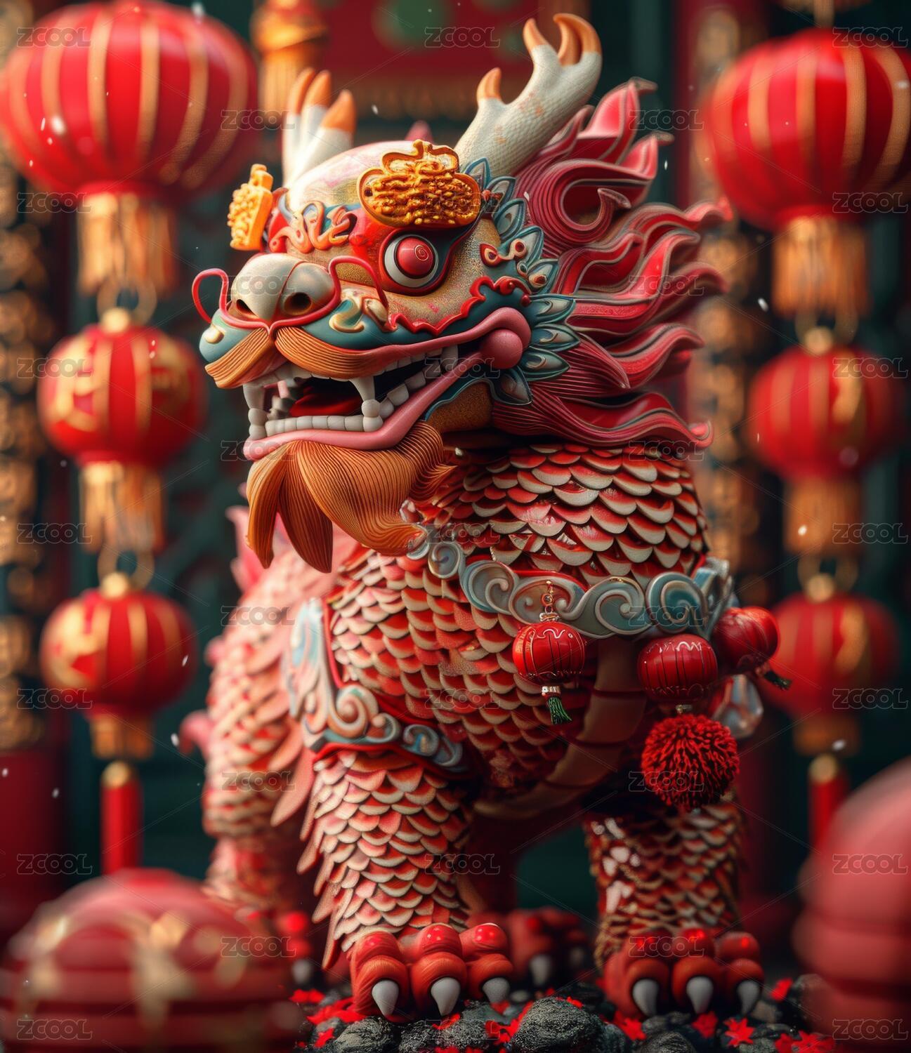 立体赛博石头狮子雕像和灯笼抽象海报背景