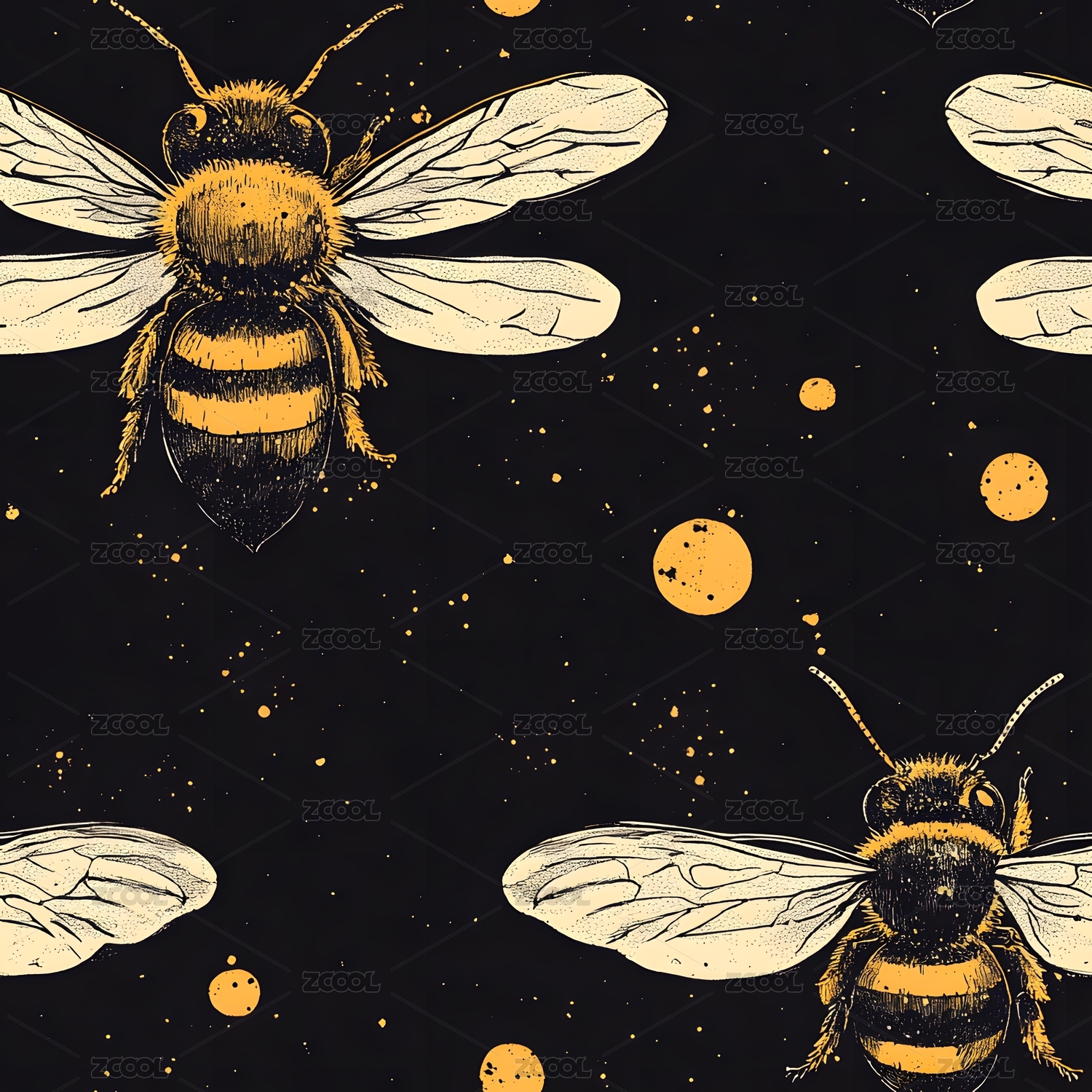 黑色背景上的蜜蜂与圆点图案