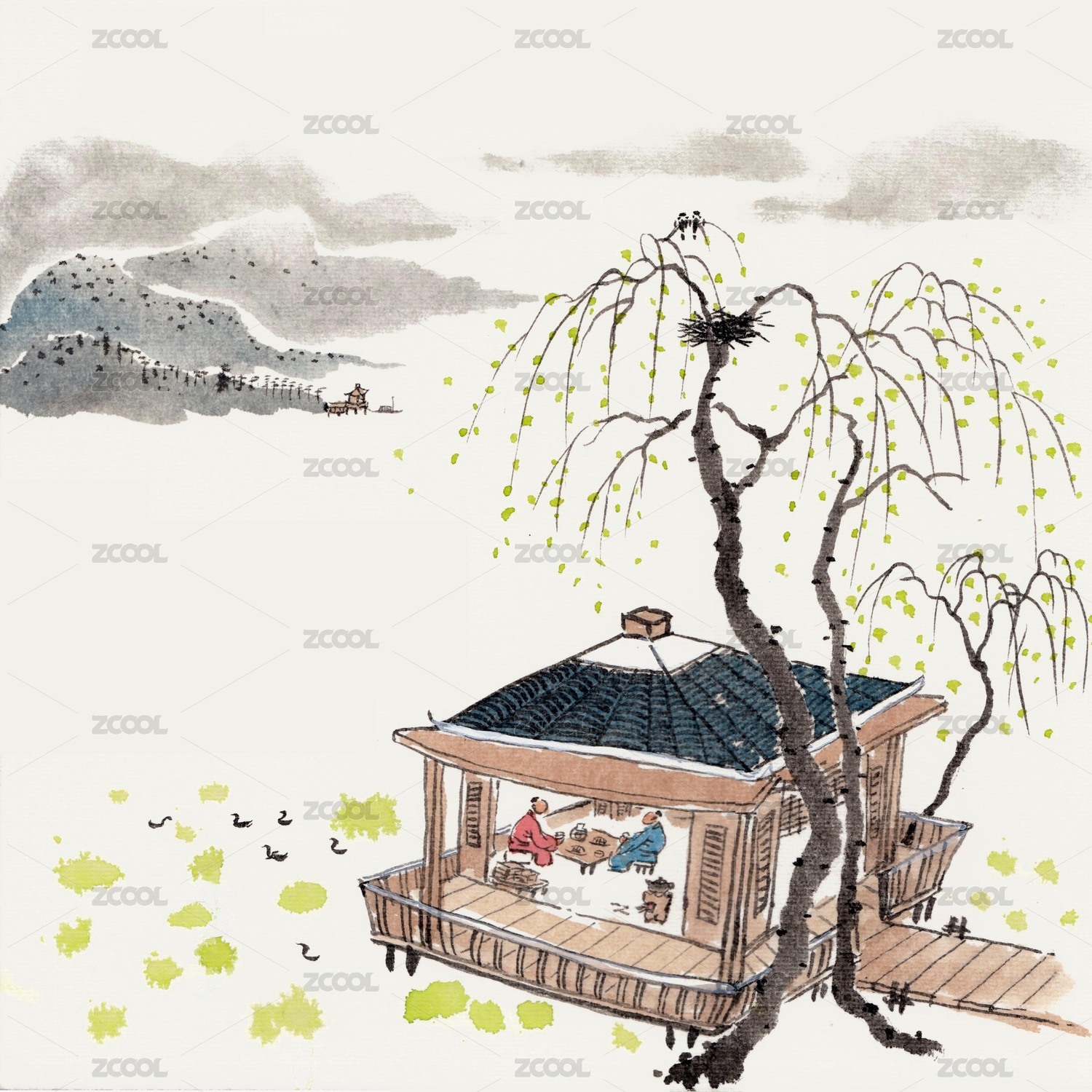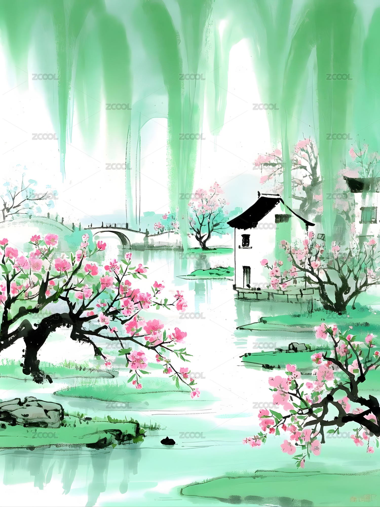 插画,二十四节气,春分,春天,桃花,竹子,水墨,唯美,古典,诗意
