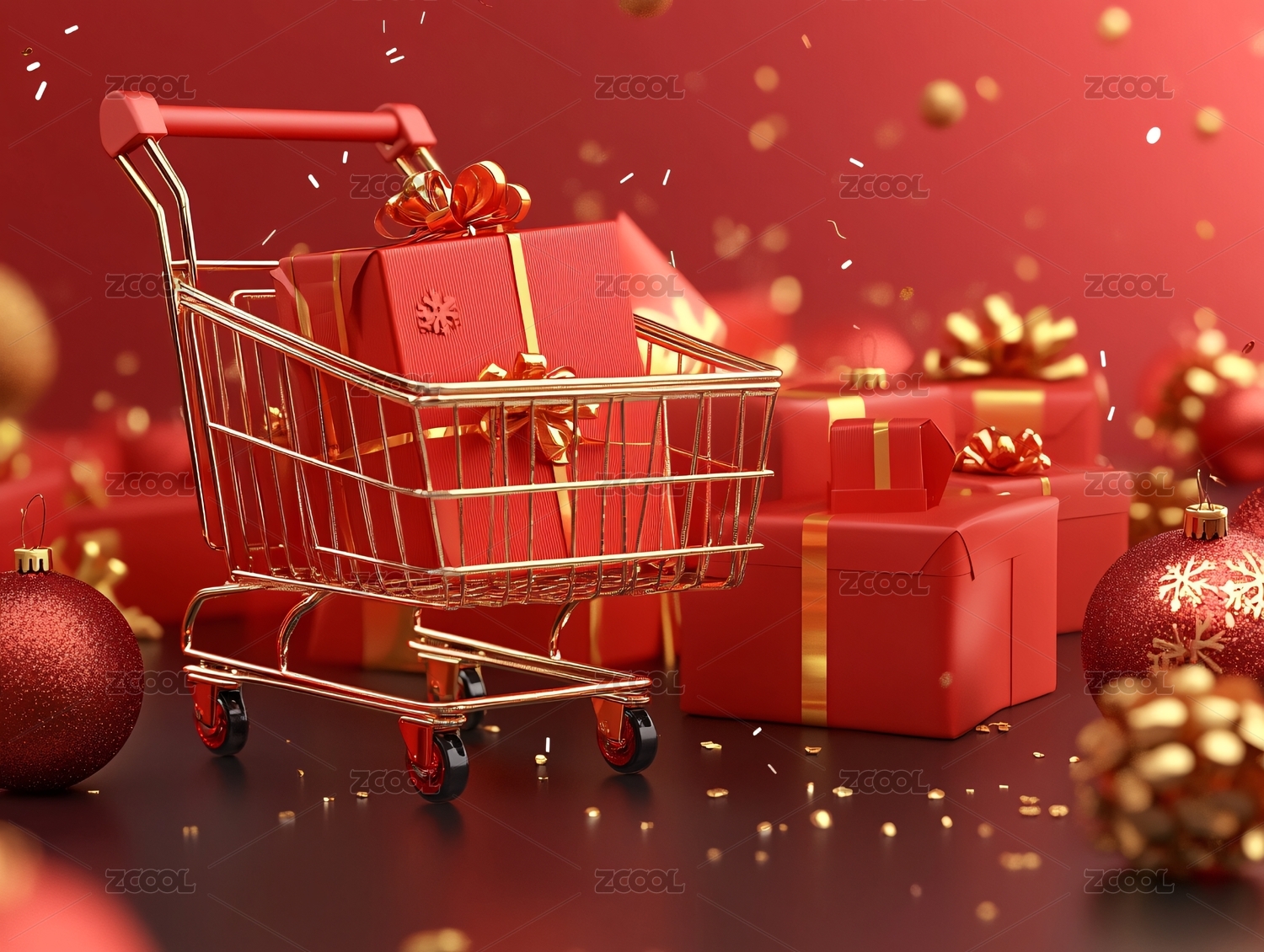 红色购物袋与礼物堆