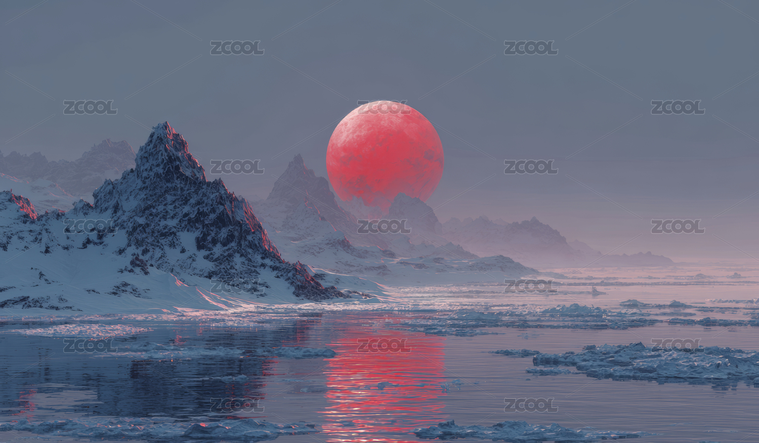 红热星体悬挂天际,云雾缭绕雪山之巅