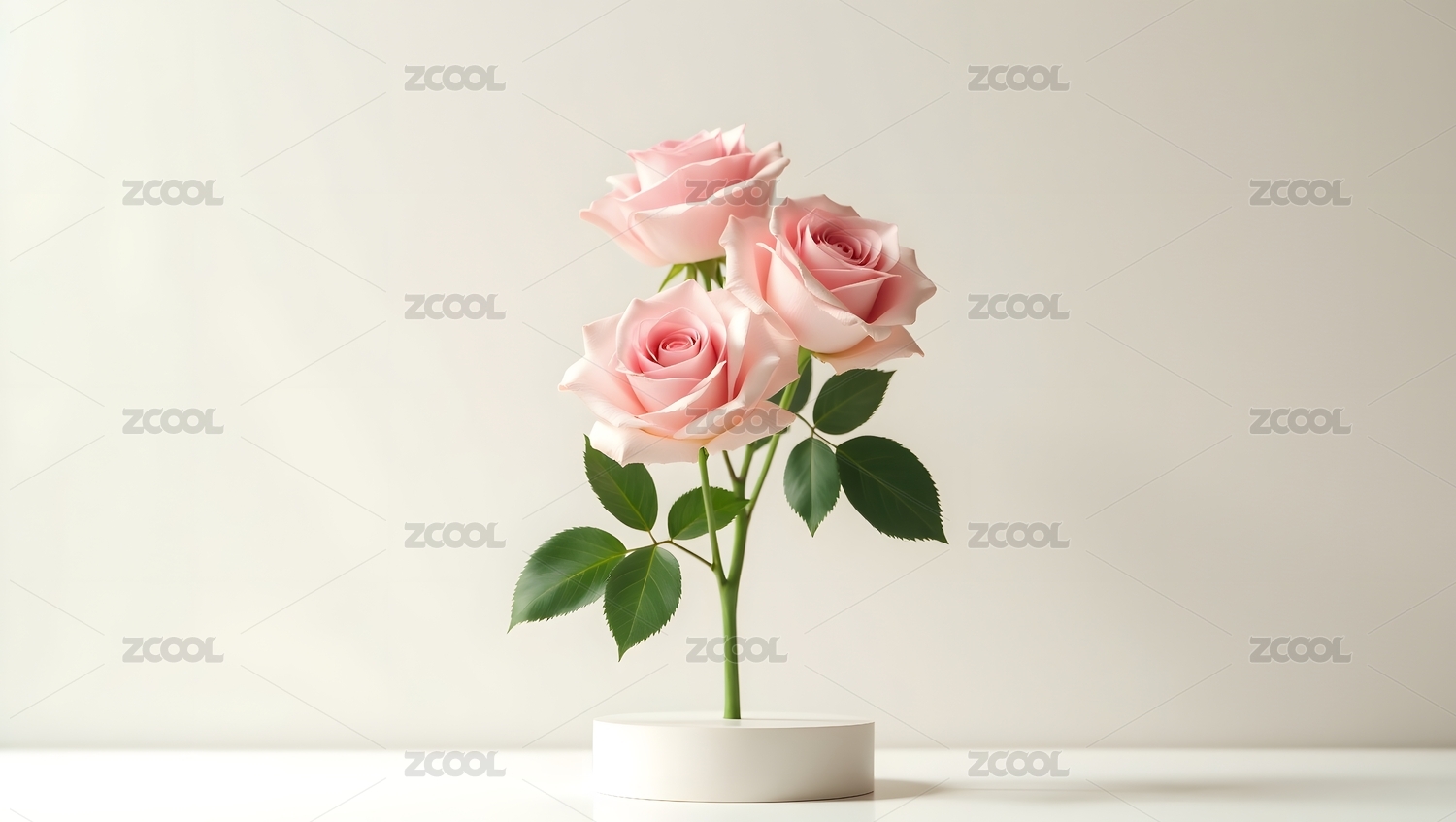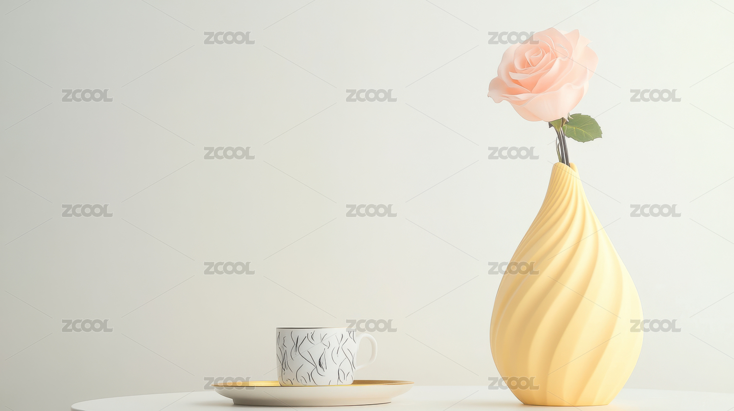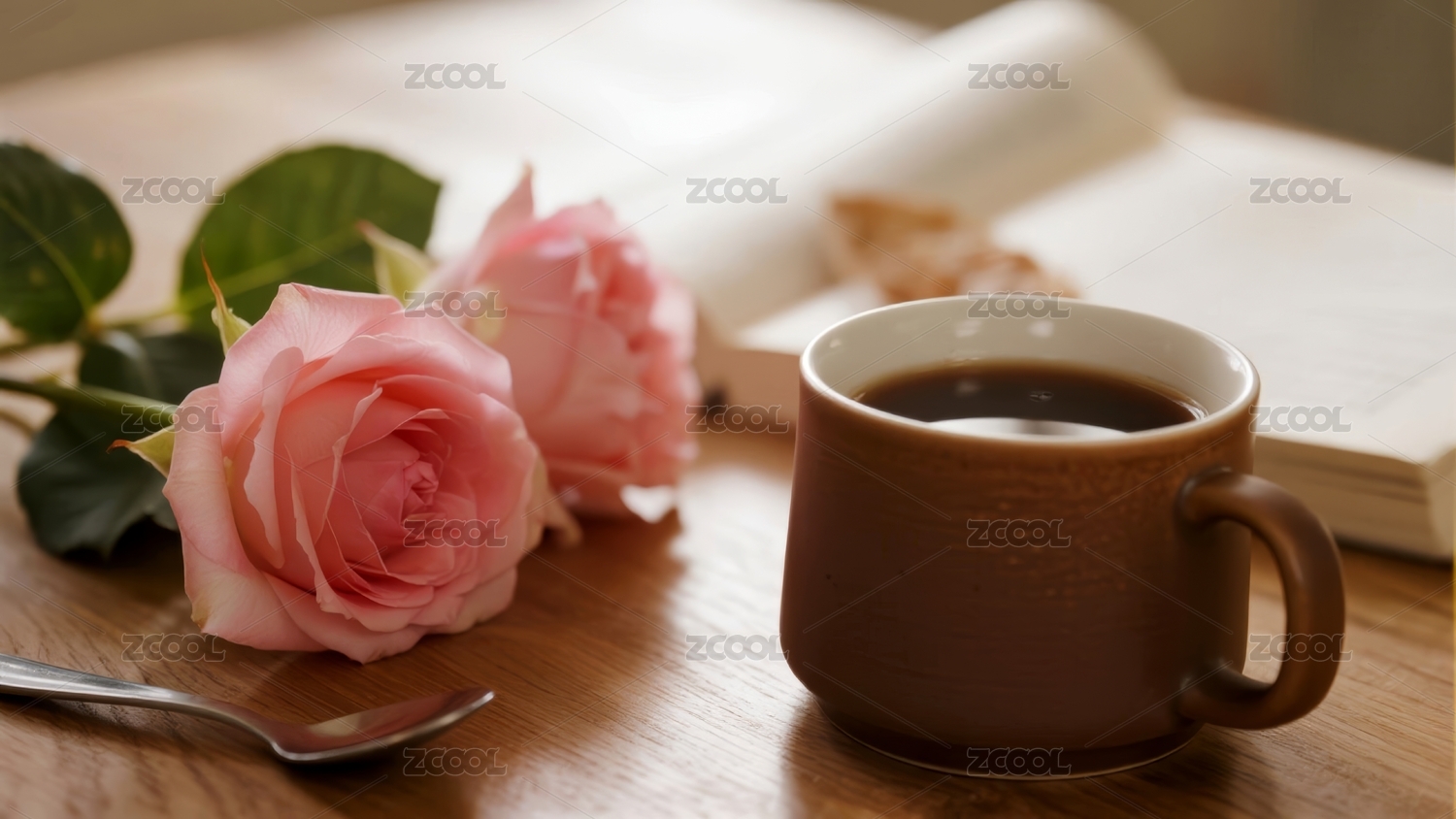 白底 上垫着格子餐布的粉色玫瑰花和咖啡