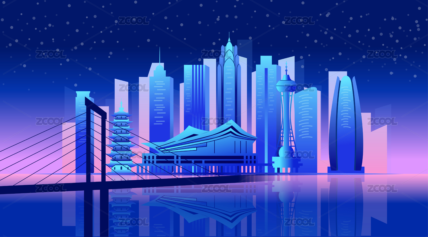 中国浙江省宁波市商务科技城市彩色矢量插画