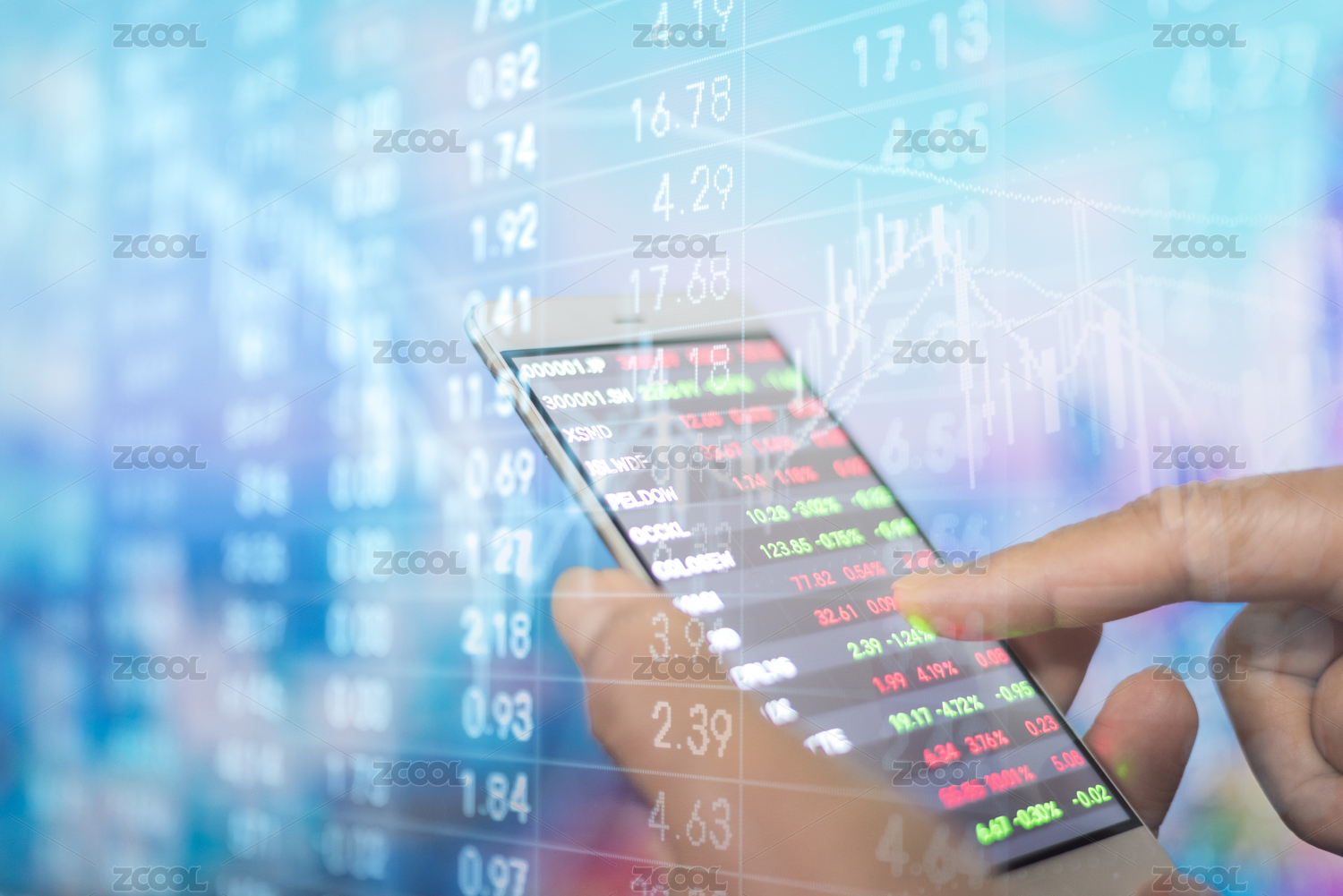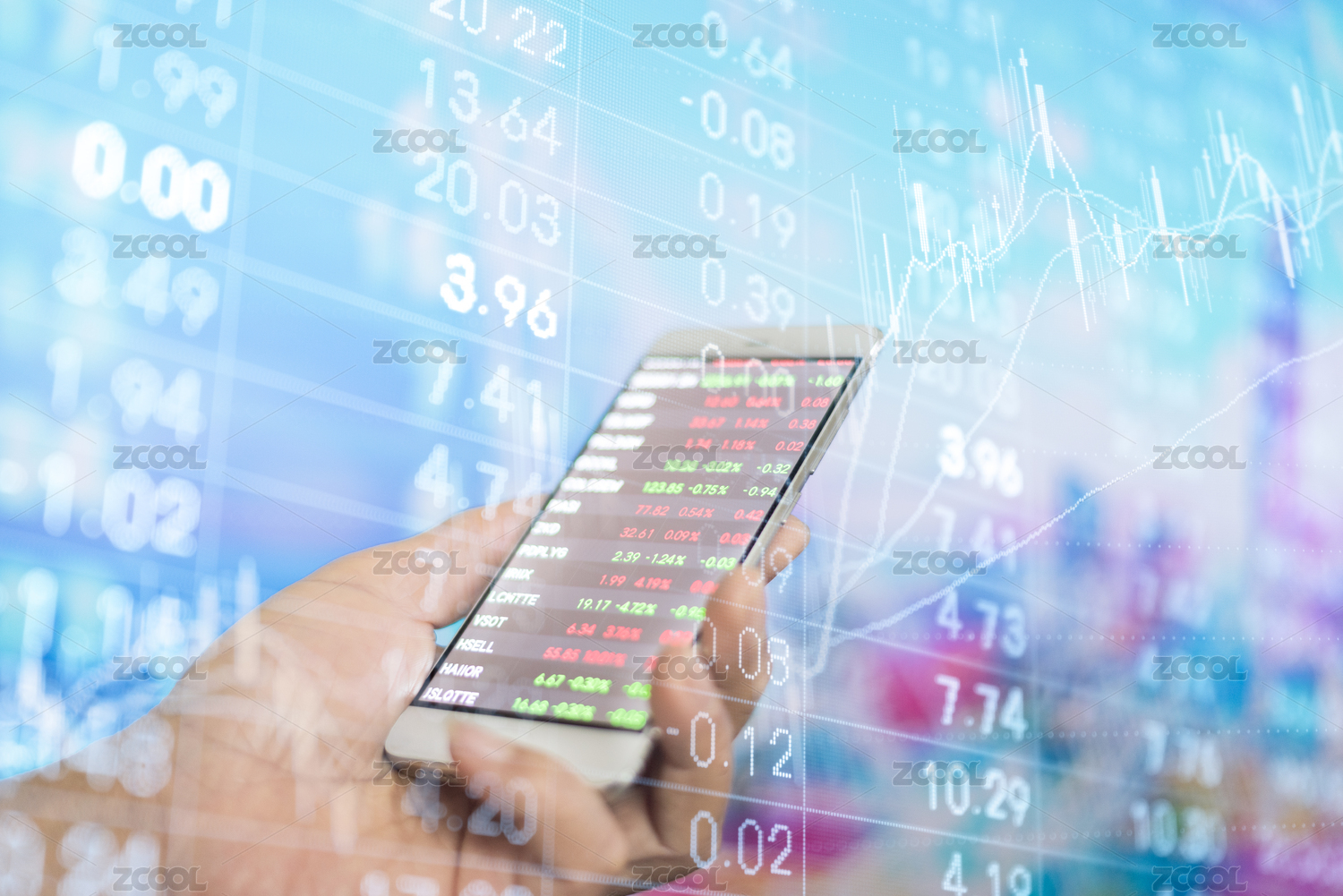 拿着手机看股票和股票背景照片
