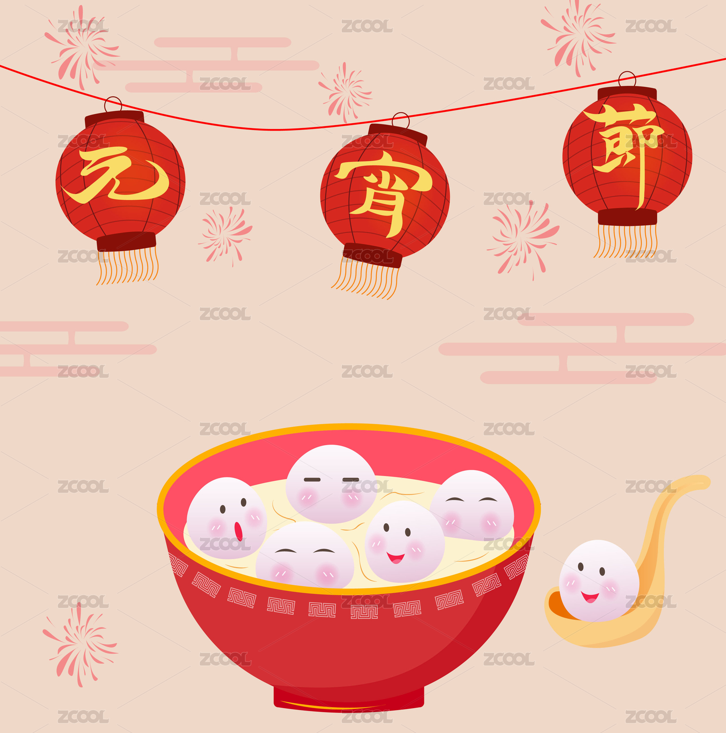 元宵节汤圆灯笼花灯元宝红包插画