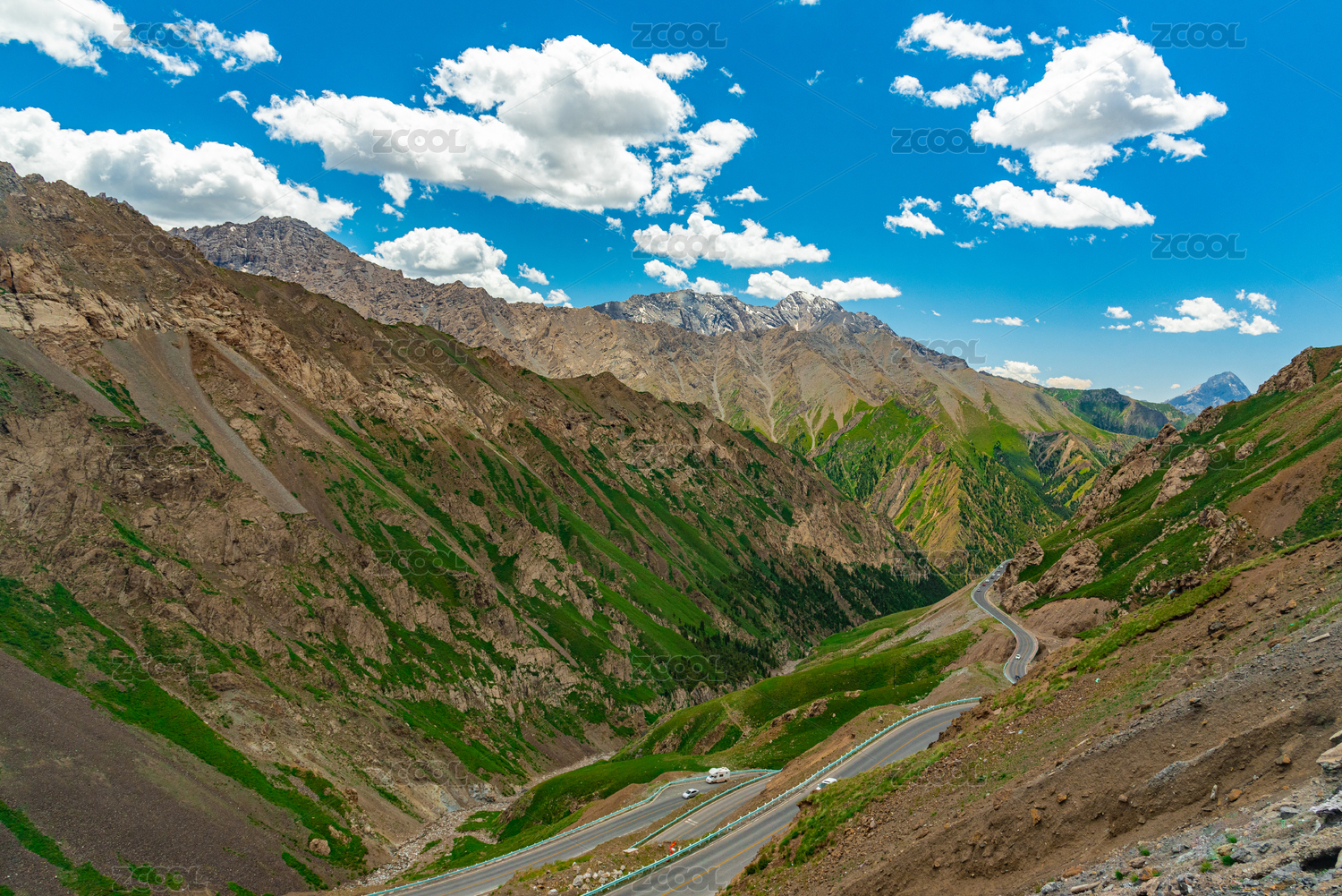 中国新疆夏季蓝天白云下G217独库公路沿途高山草原