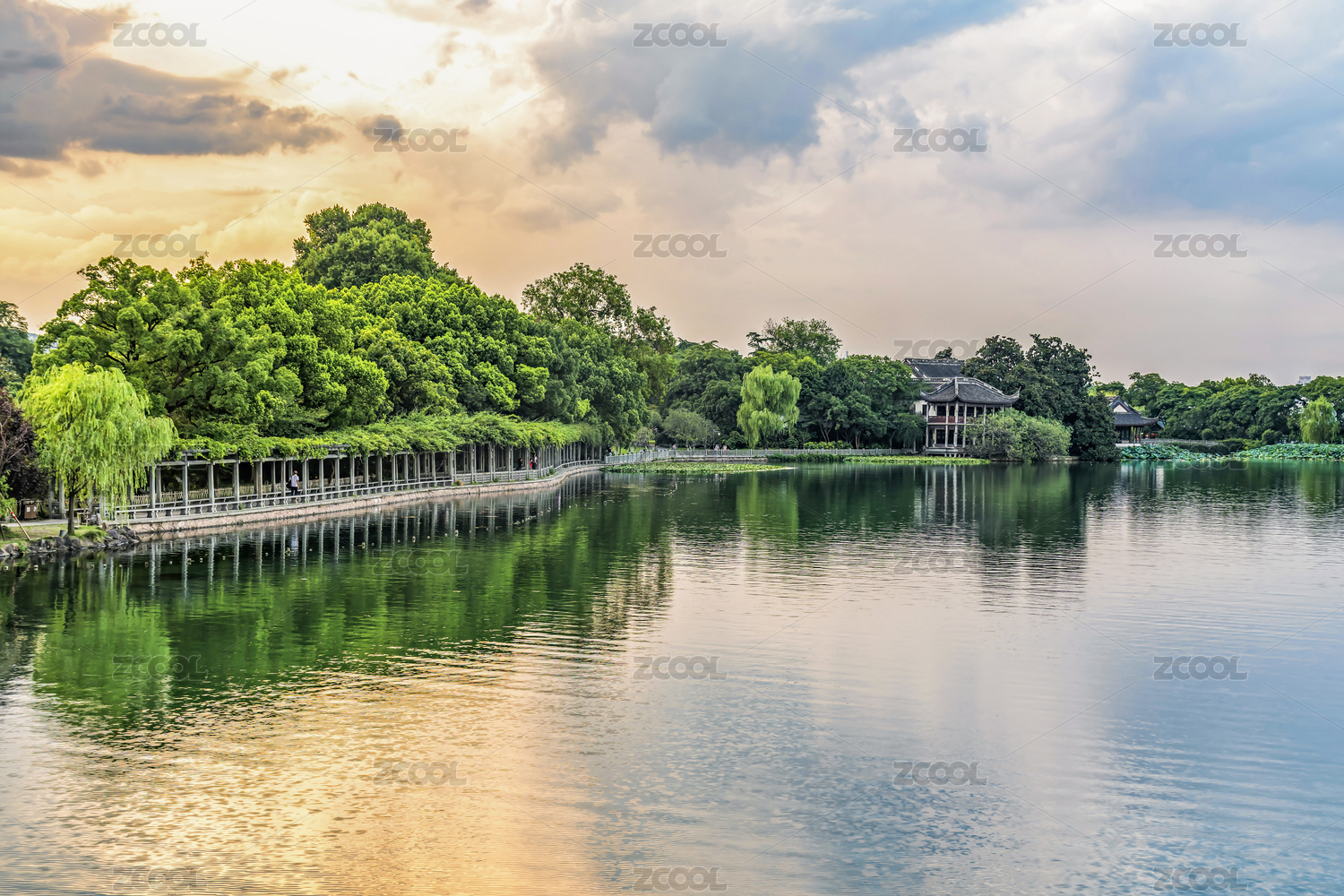 中国浙江杭州西湖景区,浴鹄湾公园的园林景观中式长廊飞虹廊