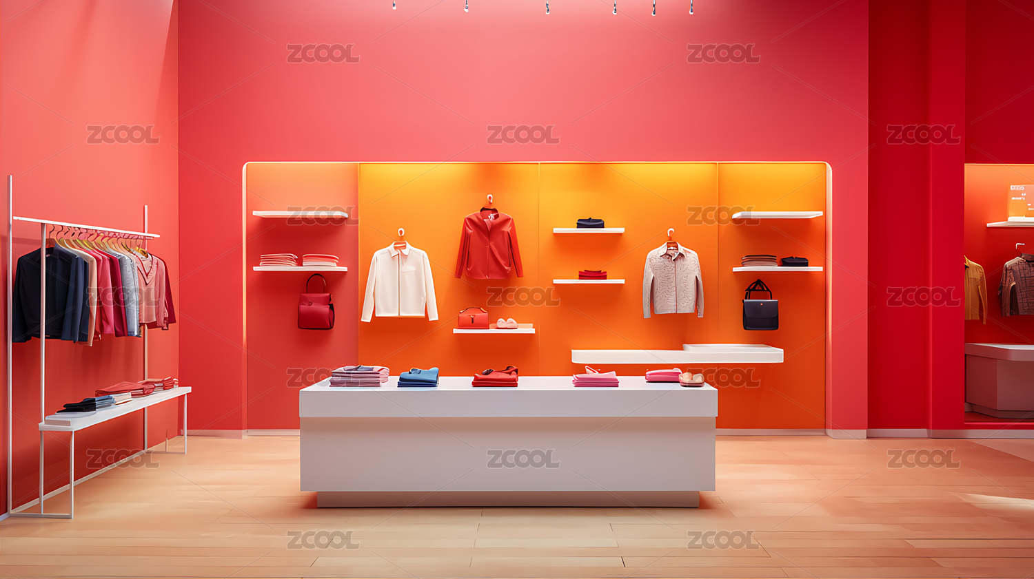 服饰,服装,店面,室内,货架,衣架,橙红色,静物,衣服,展示