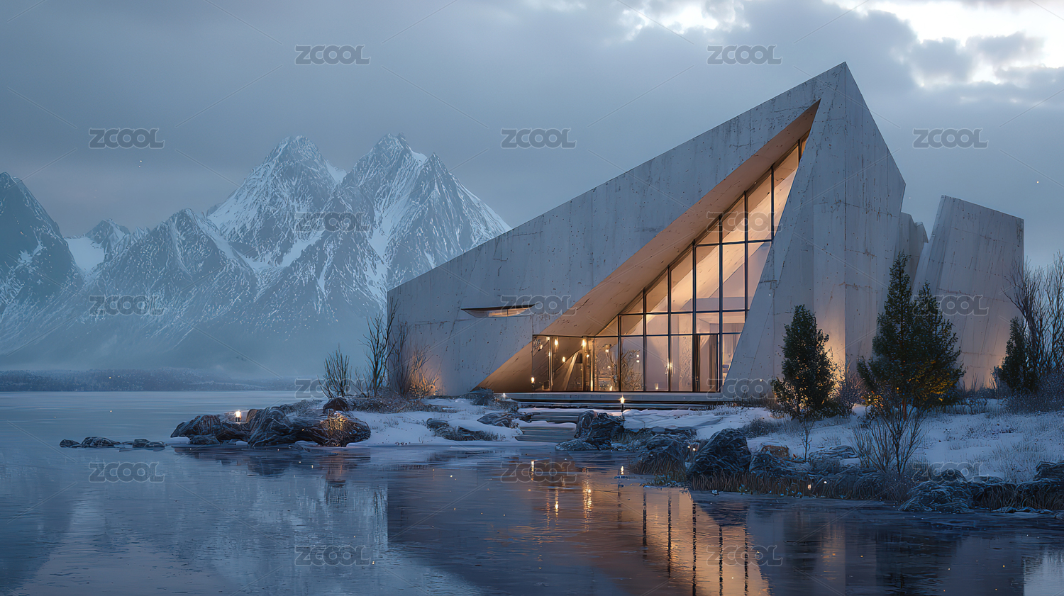冬天雪山下的现代白色建筑风景