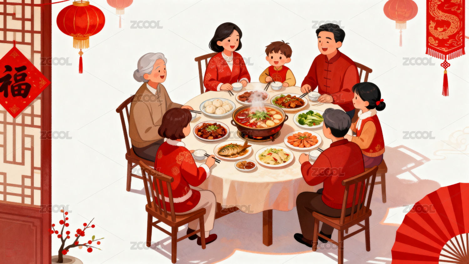 一家人围坐在圆桌旁享受着丰盛的年夜饭