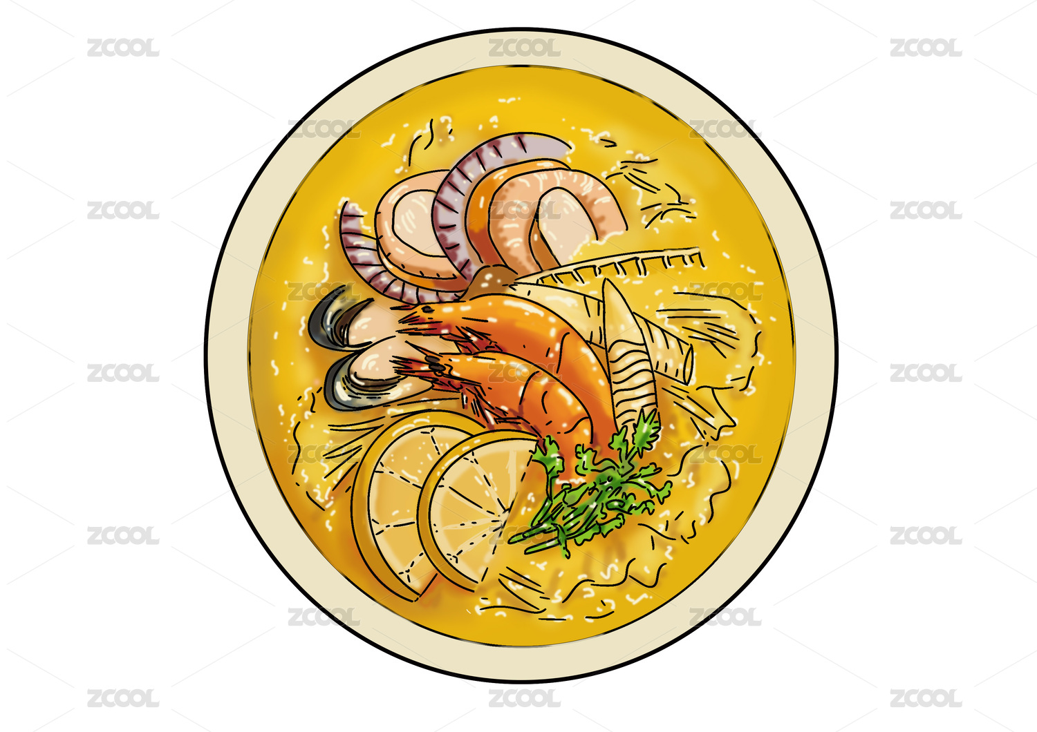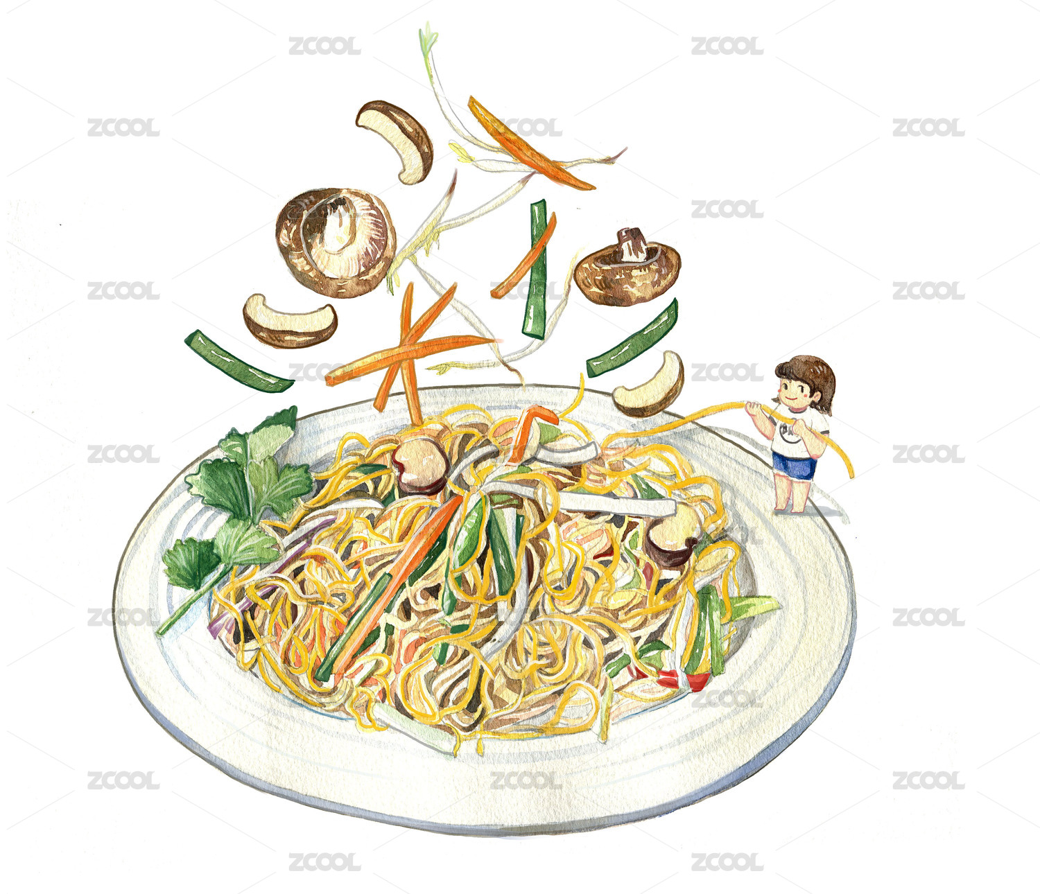 面条,米粉,炒粉,海鲜,水彩,插画,咖喱,美食