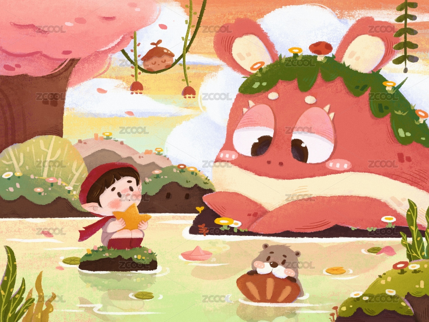 草帽女孩抱着月亮宝宝和小兔在草地上