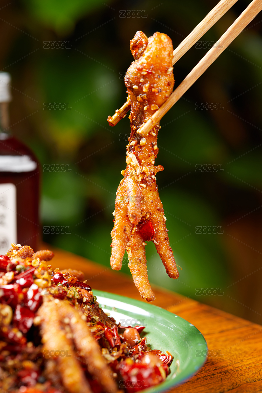 鸡爪,卤鸡爪,白芝麻,凉菜,卤菜,暗色调,棕色木纹桌面,筷子,夹住