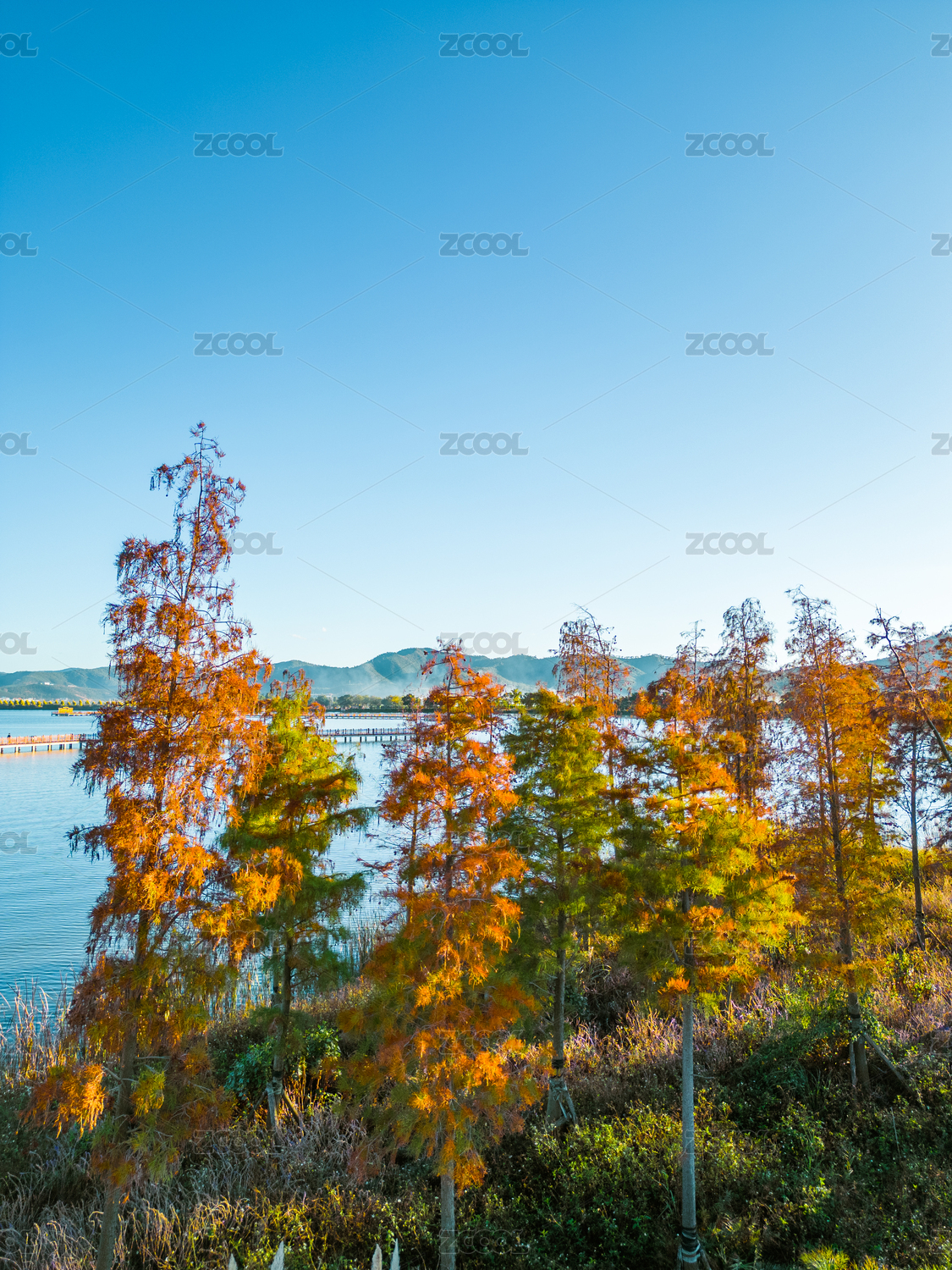 秋日湖畔金黄树林公园秋景杭州青山湖公园