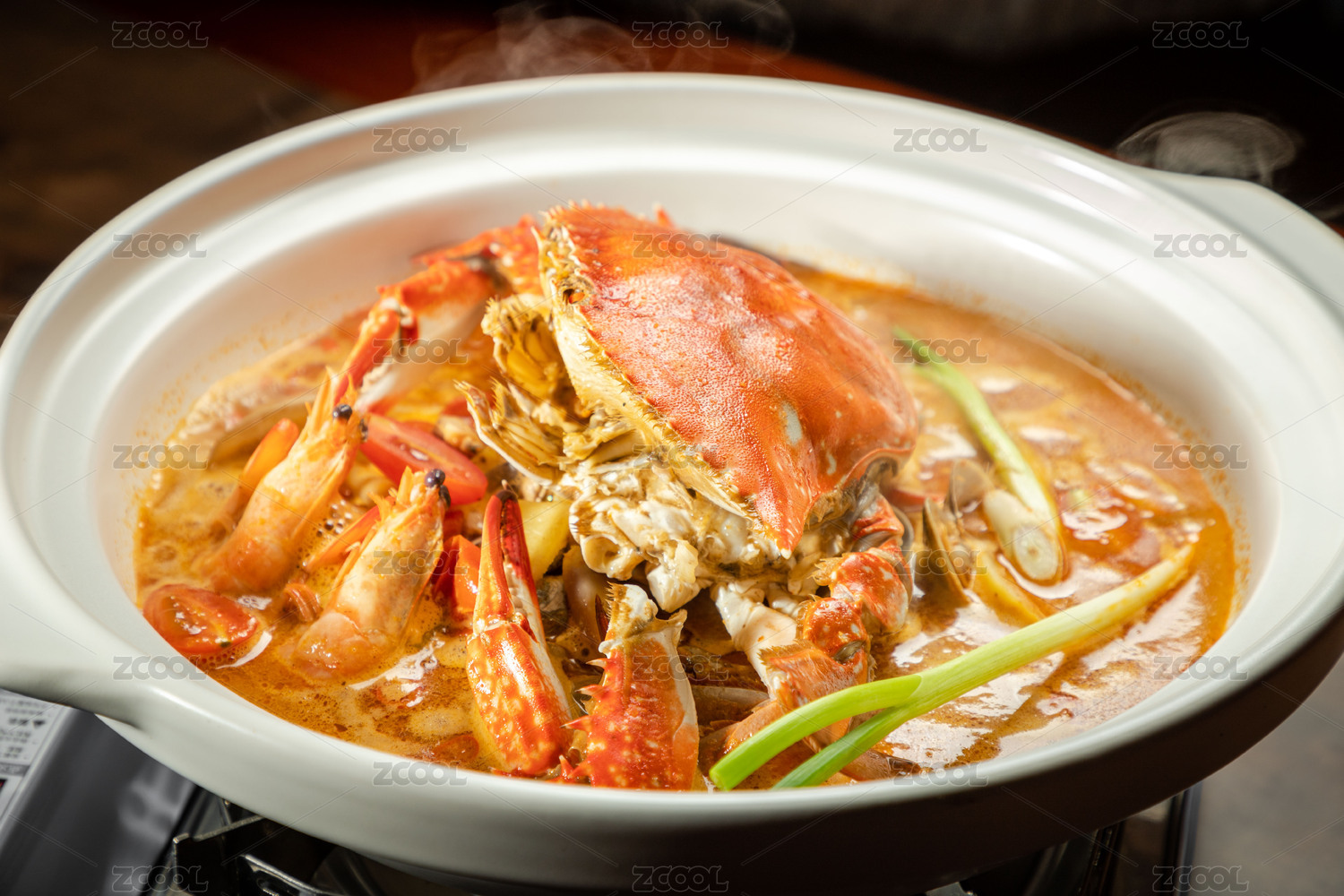 打边炉,冬阴功,海蟹,金黄色,香葱,泰国菜,大虾,棕色桌面,砂锅,锅仔