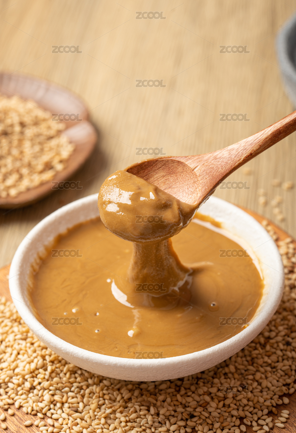 芝麻酱,白芝麻,木碗,粘稠,油亮,木勺子