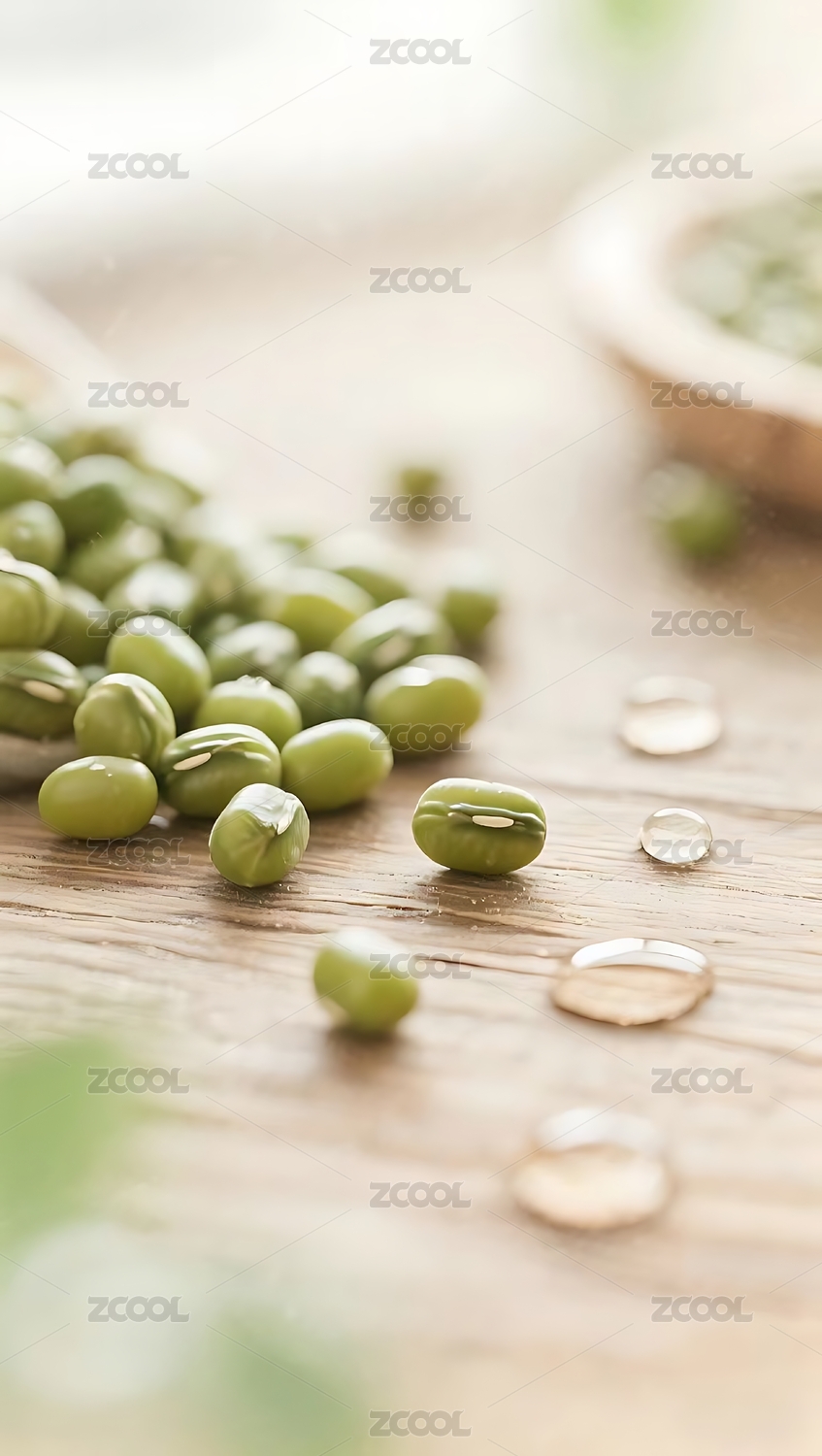 绿豆,木碗,木勺子,棕色桌面,颗粒,绿色,豆子,散落,密集