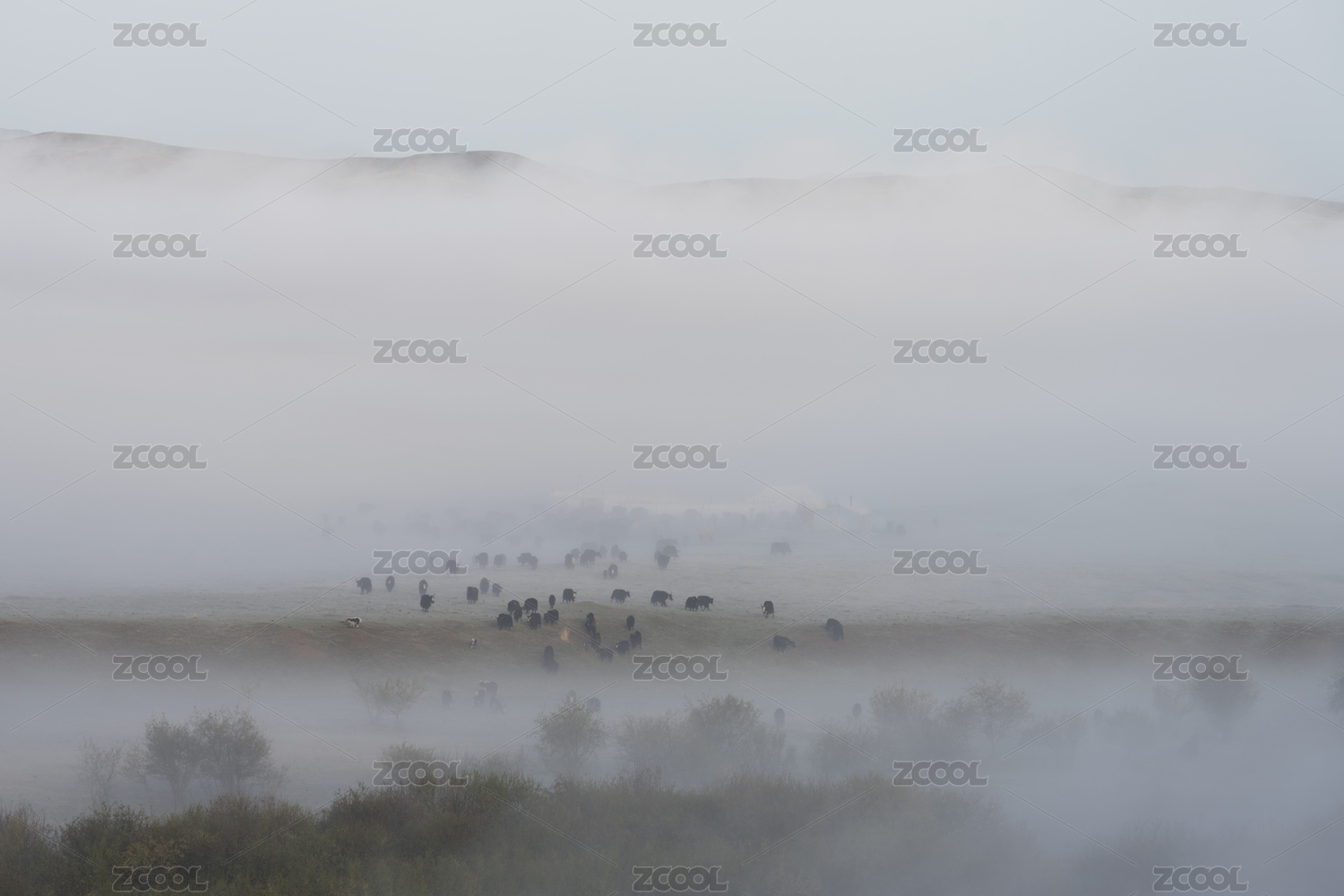 中国四川若尔盖黄河九曲第一湾的晨雾
