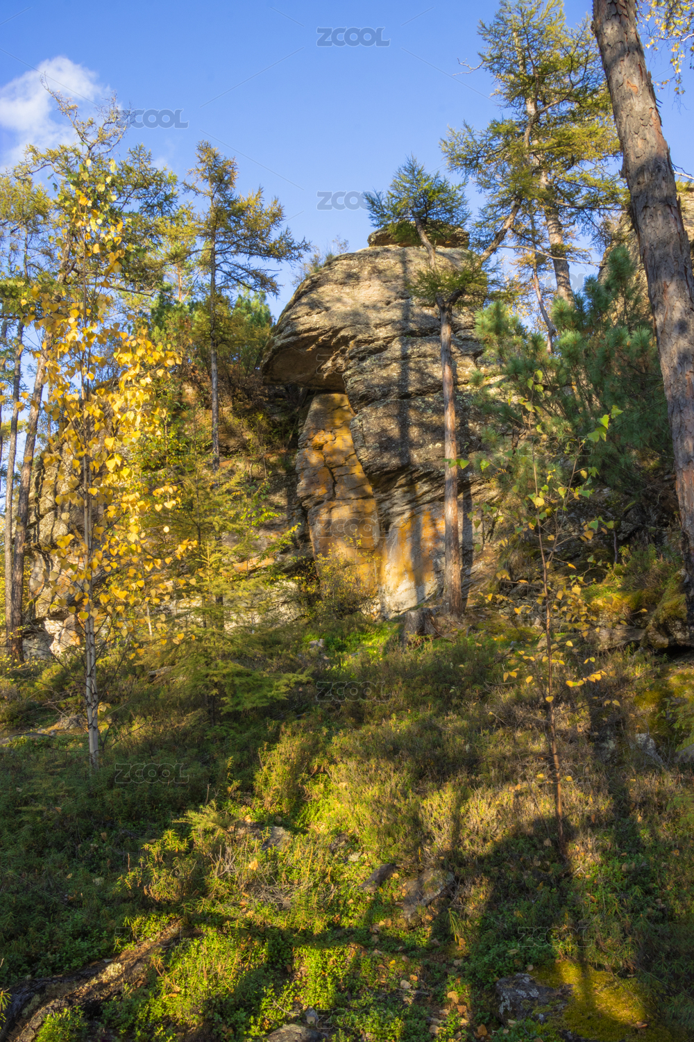 中国大兴安岭呼中苍山石林秋季岩石与自由生长的五彩植被