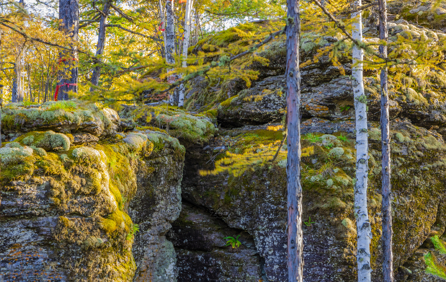 中国大兴安岭金秋苍山石林景区生长着苔藓的奇石与树