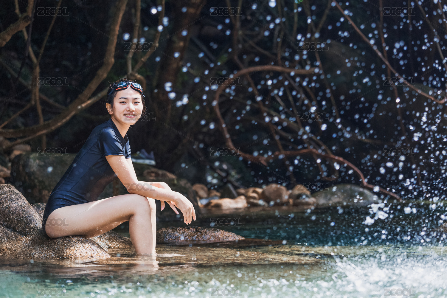 近距离查看的年轻日本女孩喜欢留在温泉池,并关闭她的眼睛。