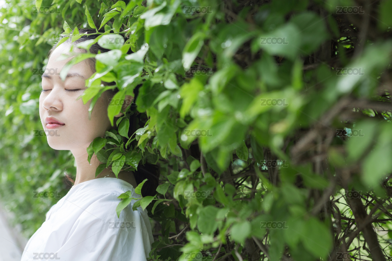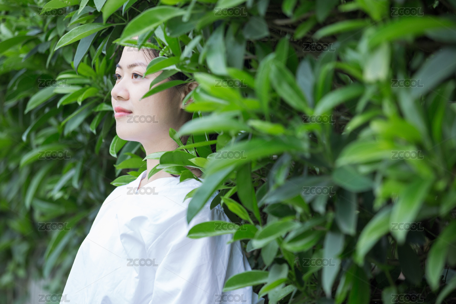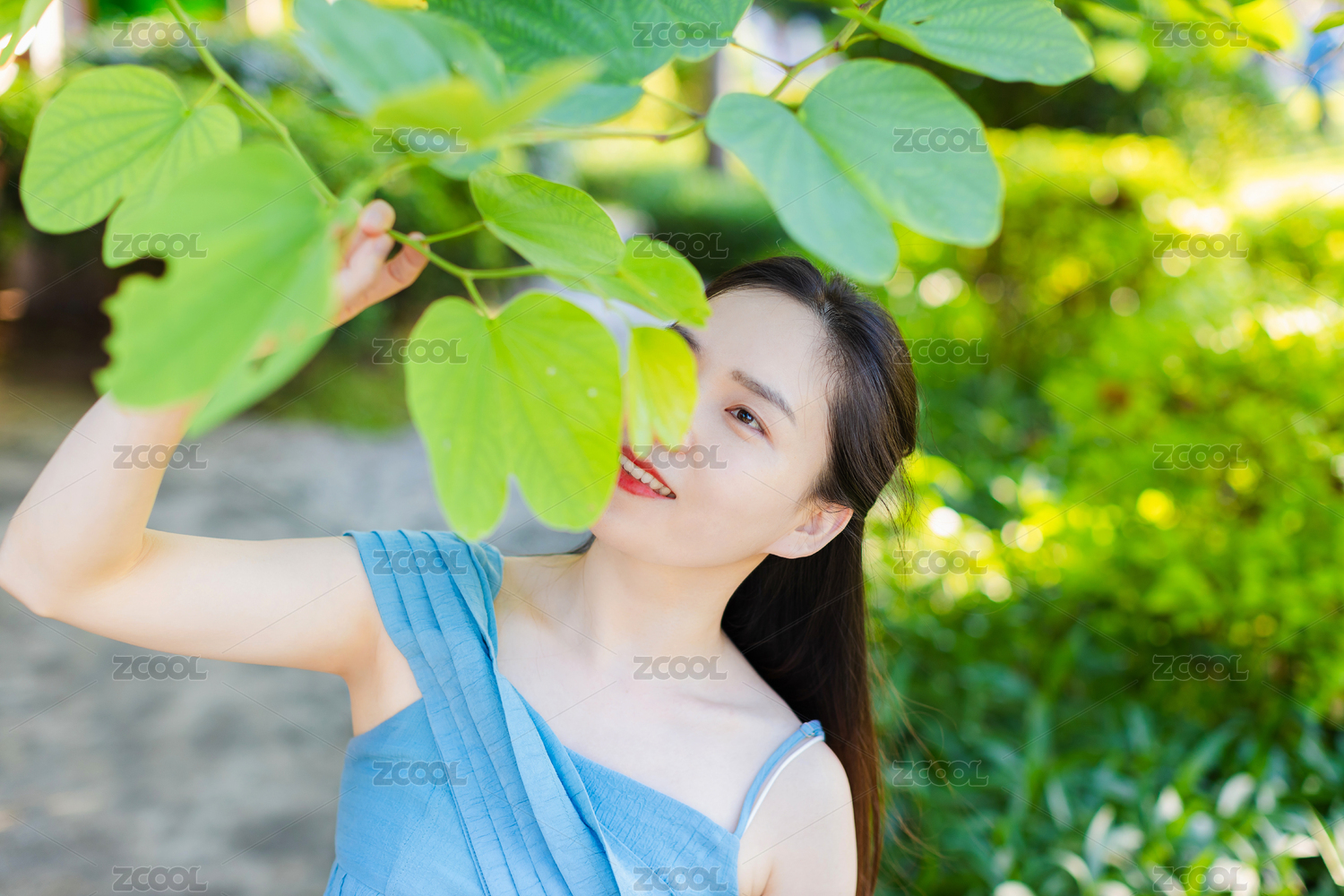 夏天年轻漂亮的美女穿着休闲装在树林里