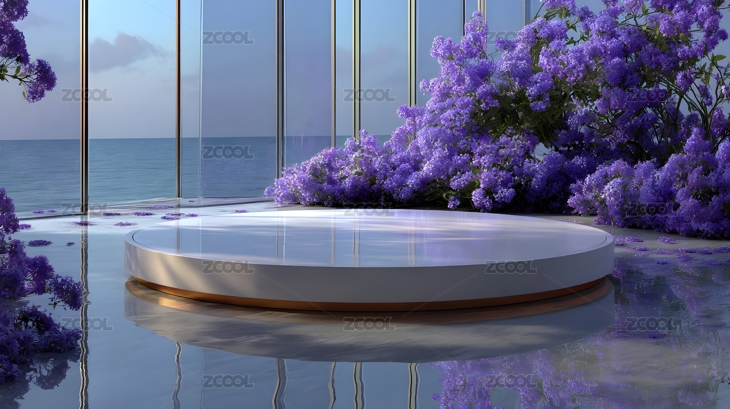 紫色花海与简约圆台