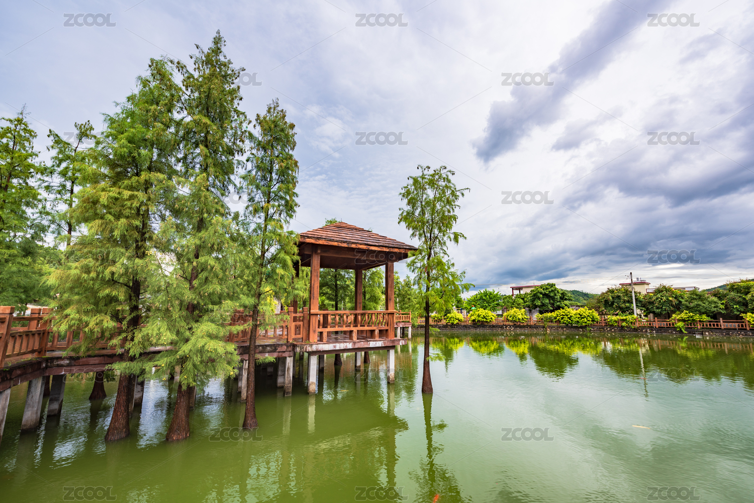广东清远佛冈上岳古村里湖泊的雨后风光