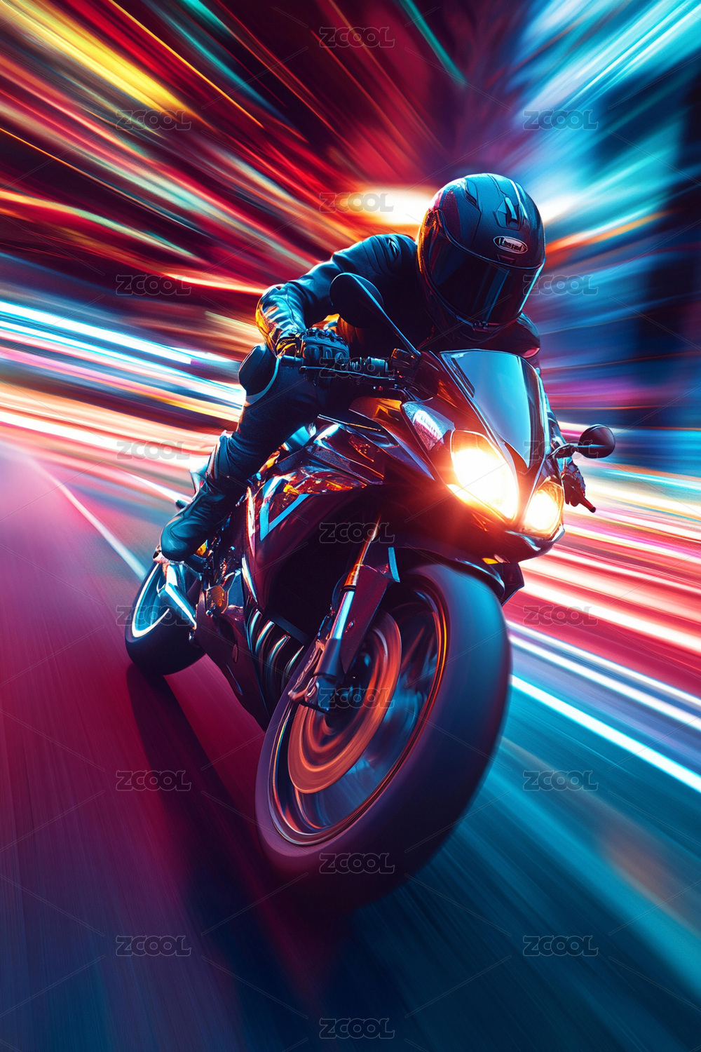 一个骑手骑着科技感摩托车在霓虹灯中行驶