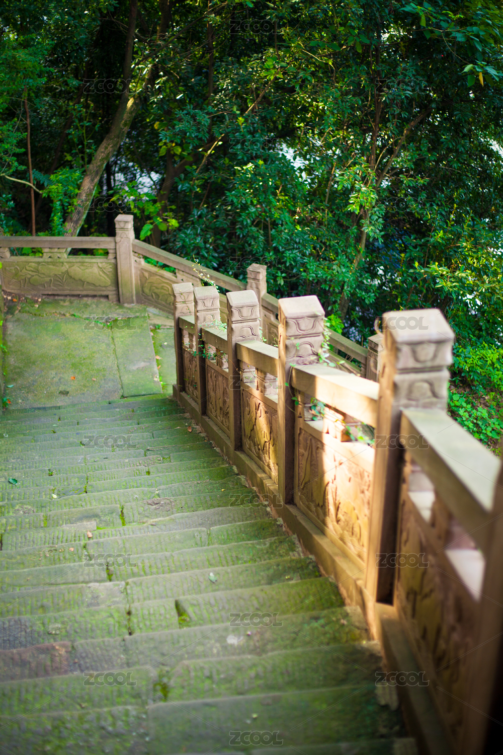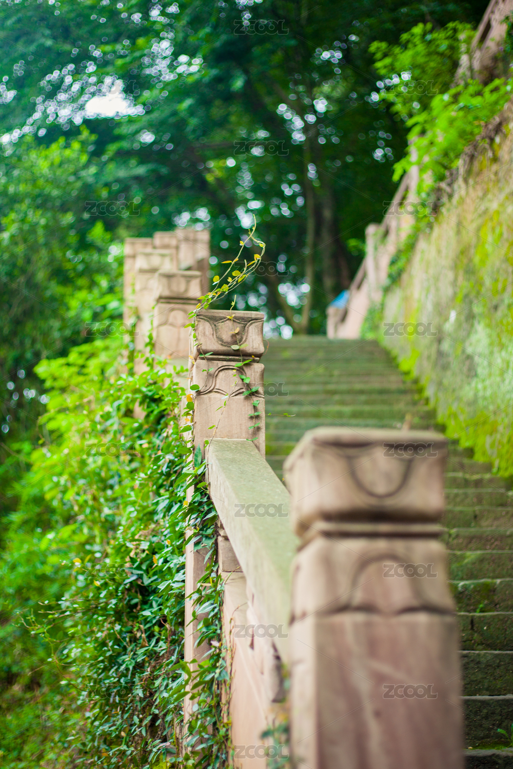 雨中杭州市雷峰塔景区放生池围栏上的石狮子侧面照