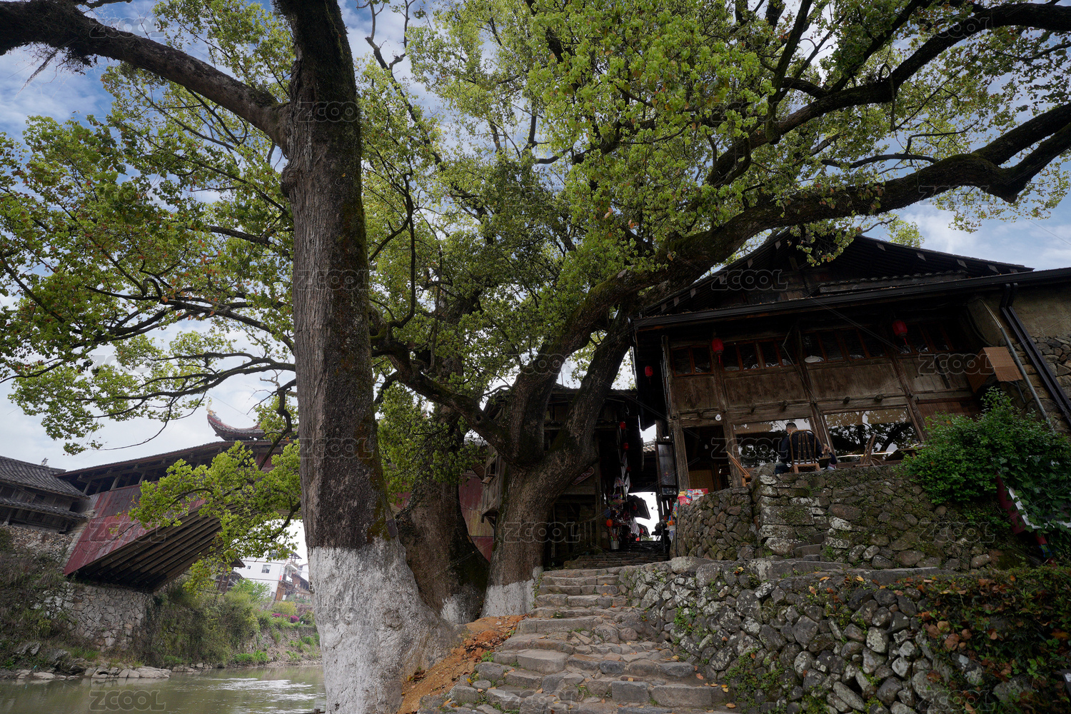 中国浙江省杭州富春江镇风光及千年古樟树风
