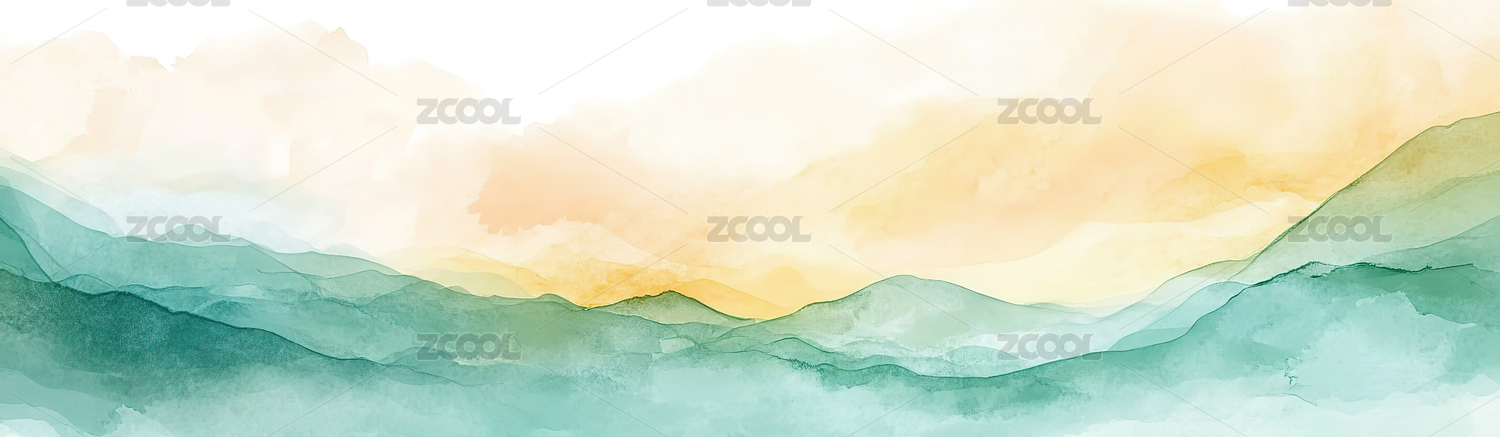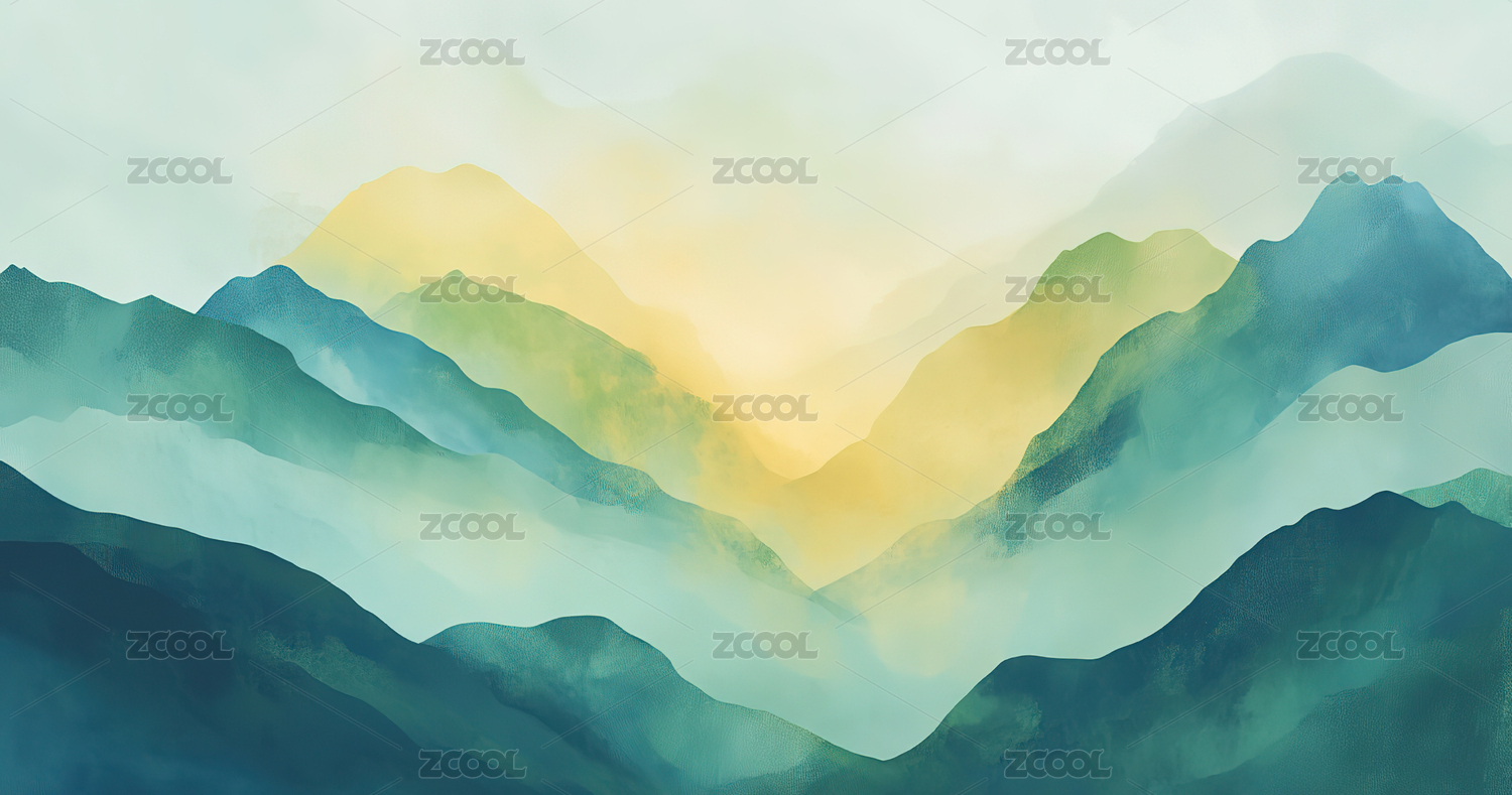 水彩云雾环绕仙境山脉插画海报背景