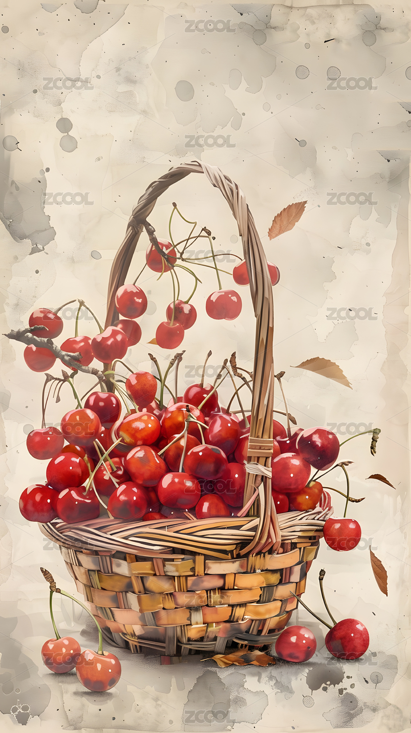 AIGCFG,中国风,水墨,插画,中式风格,水果,樱桃