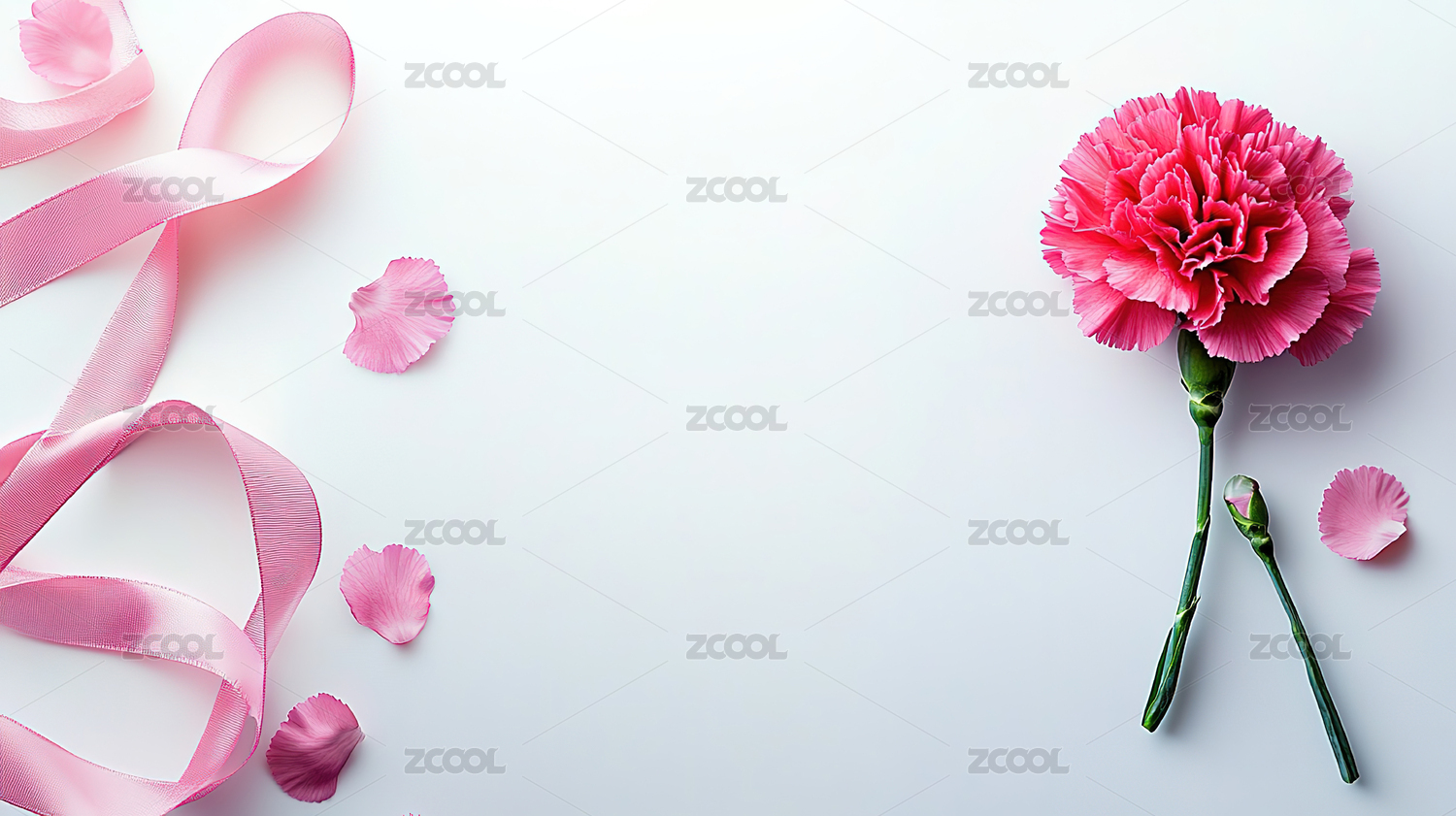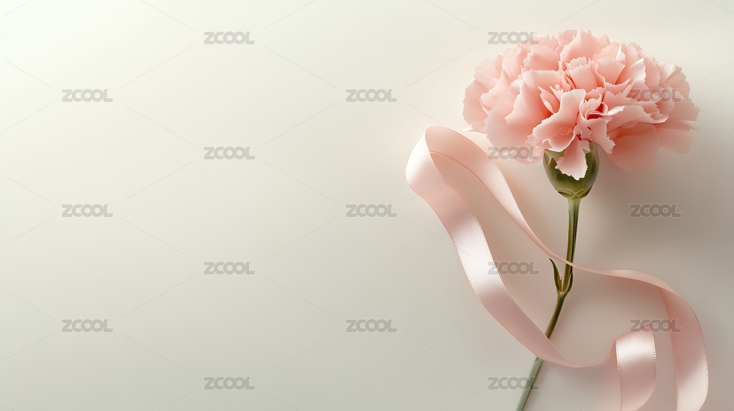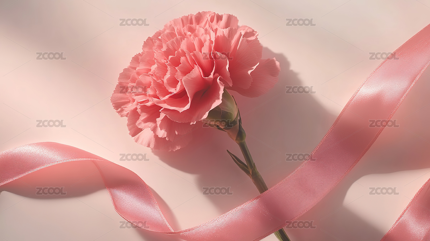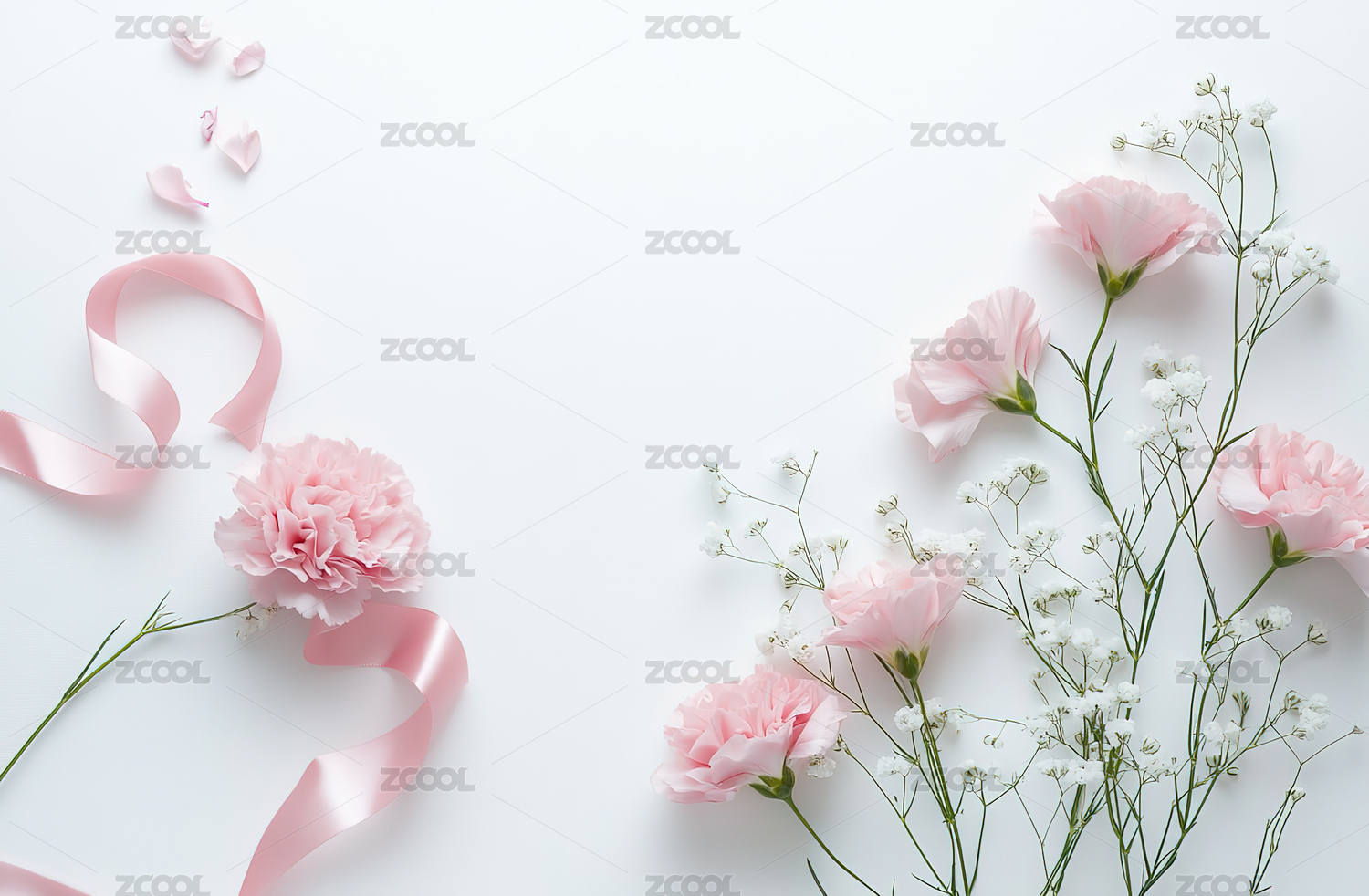 浅粉康乃馨配丝带白背景花艺摄影素材