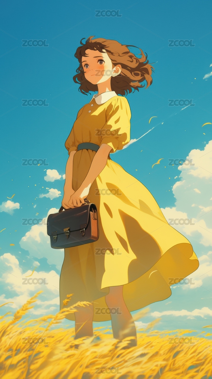 穿黄色连衣裙的女孩在麦田中行走